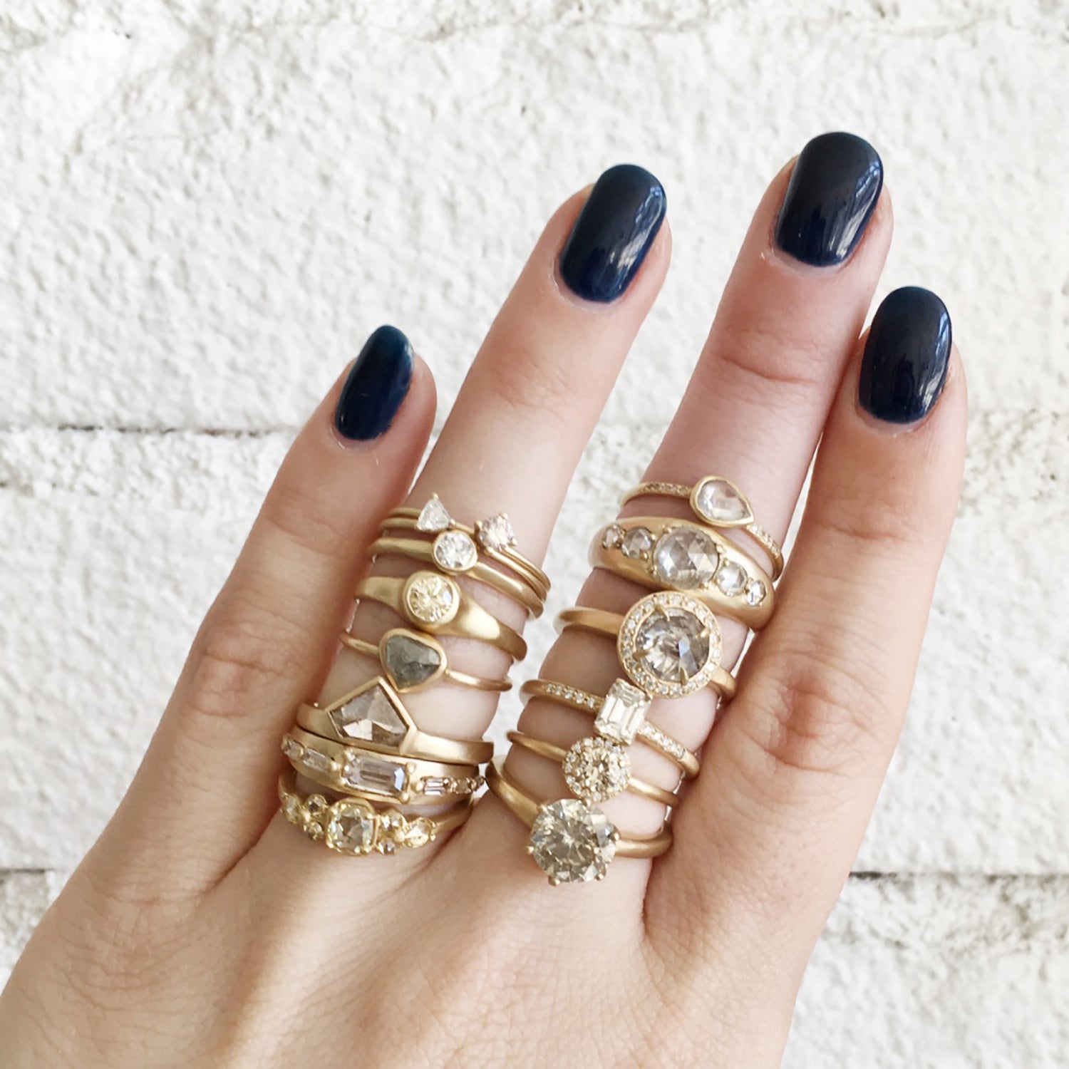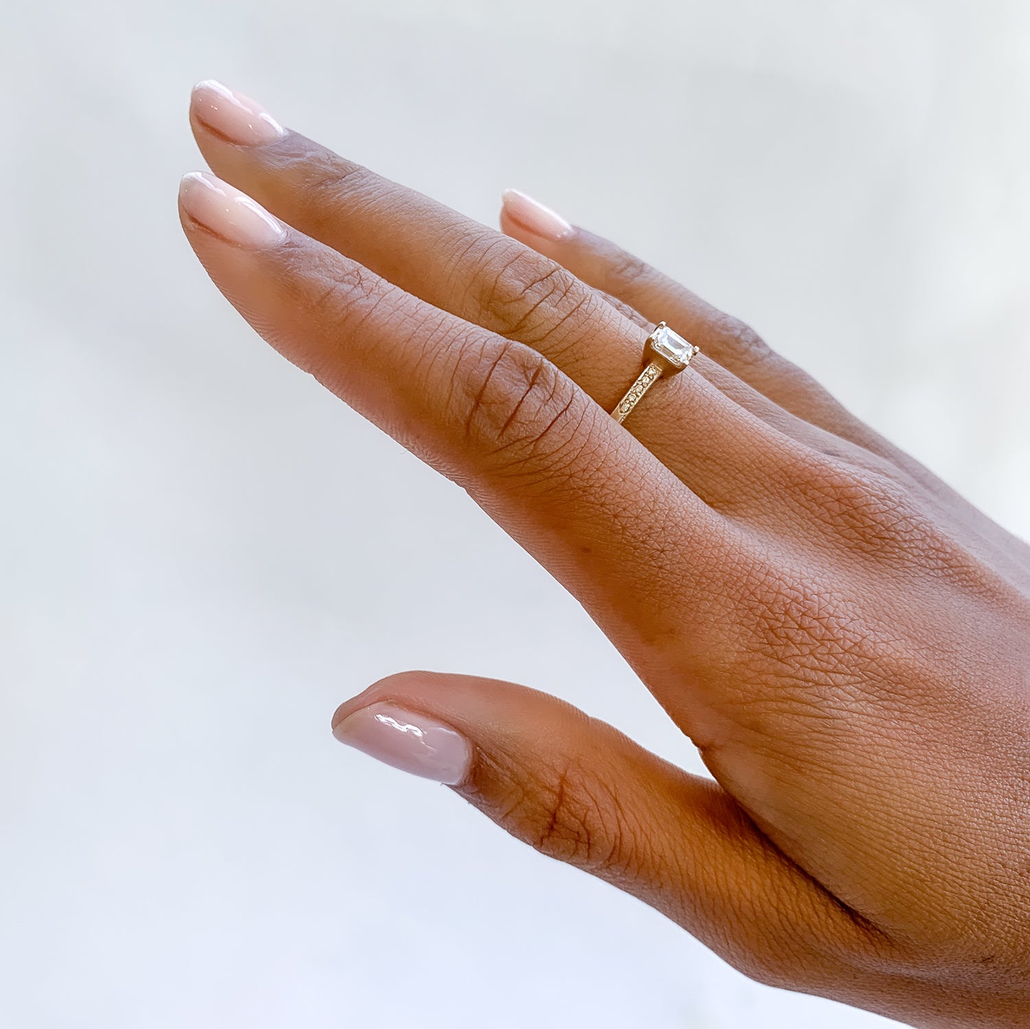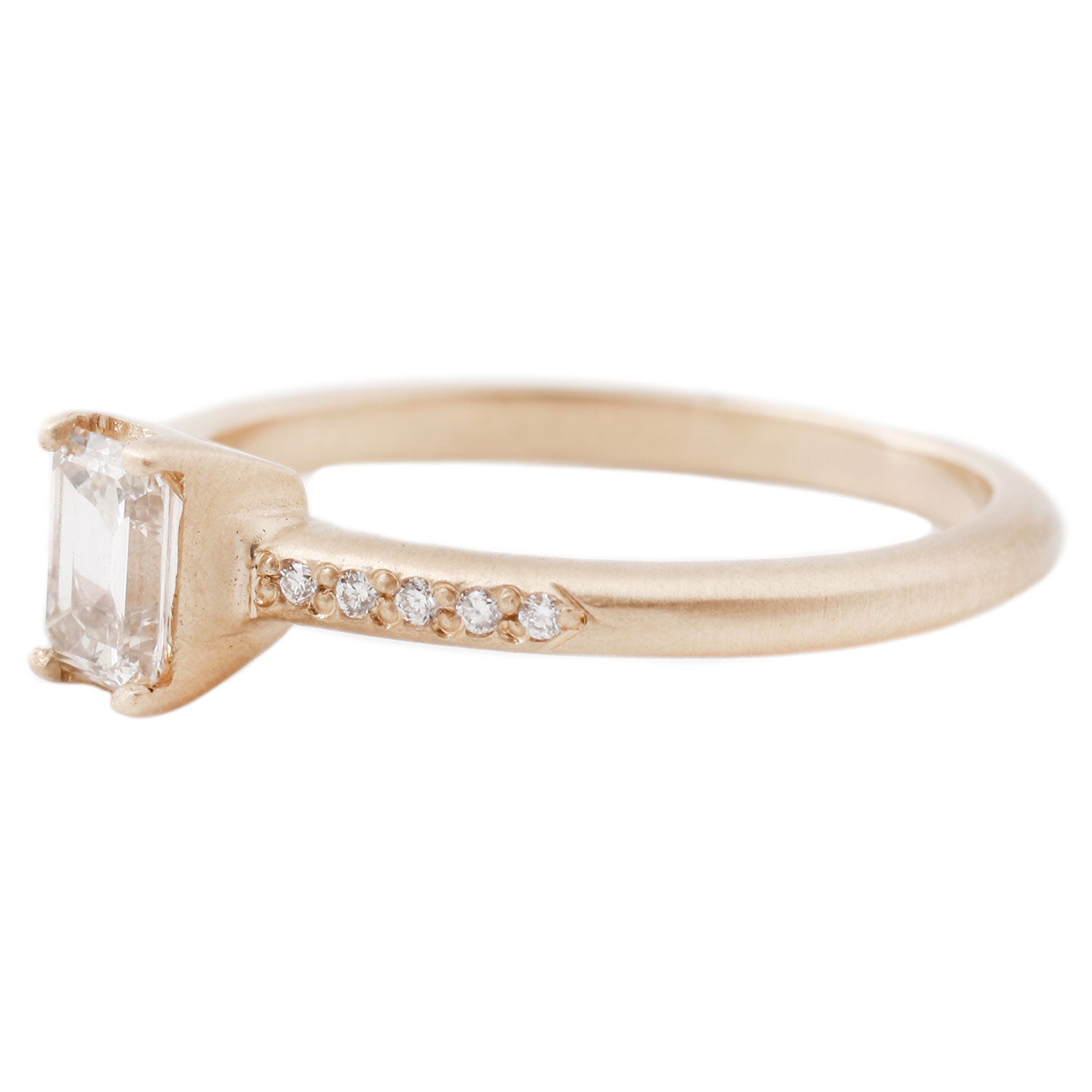 14k yellow gold ring with a 0.5ct emerald cut white center diamond with .05ct pavé side diamonds. One of a kind ring made by Rebecca Overmann.