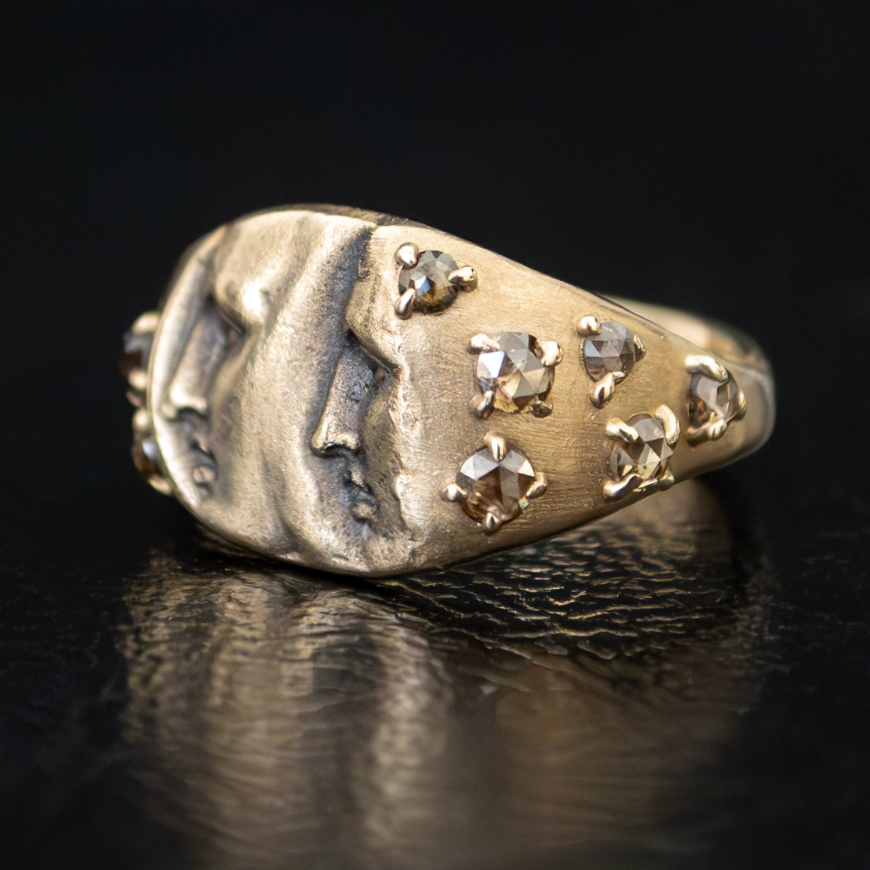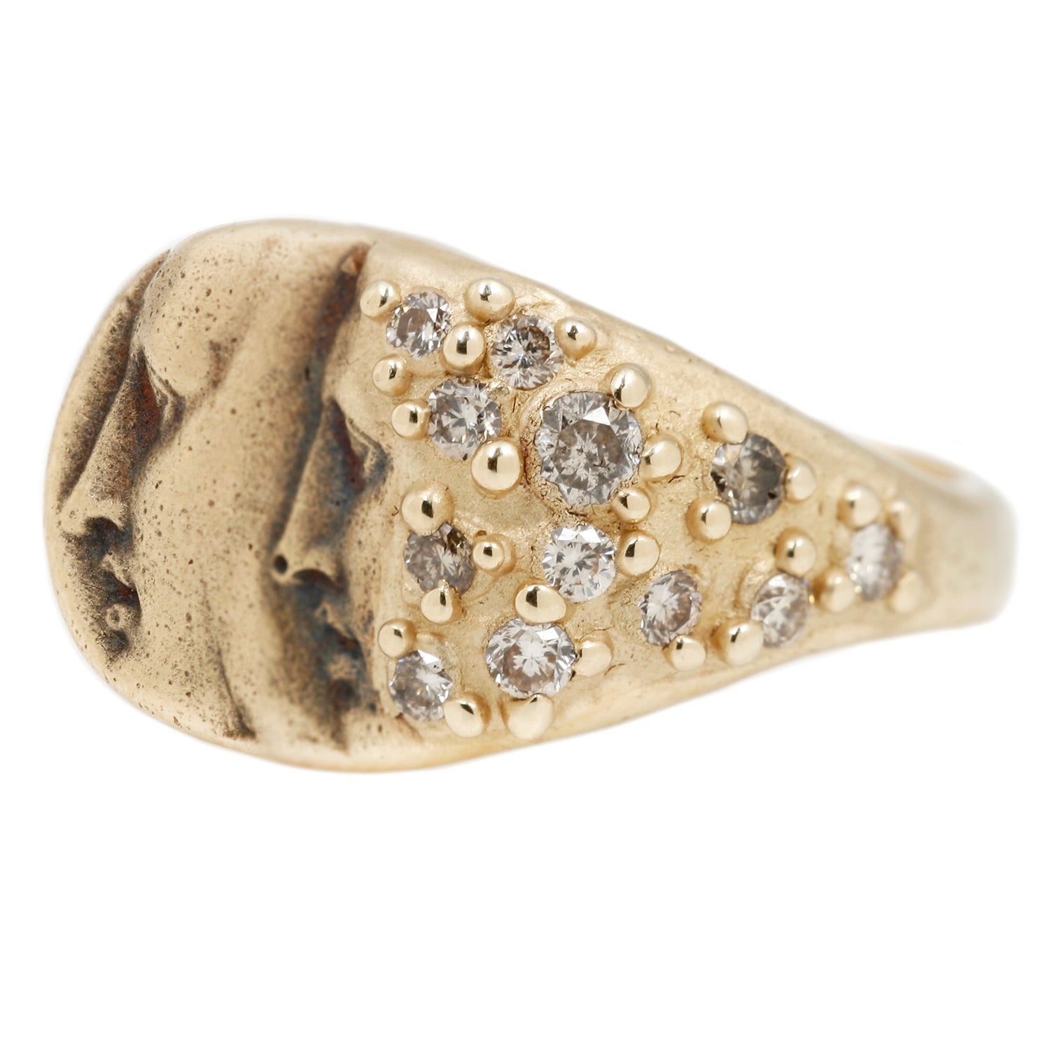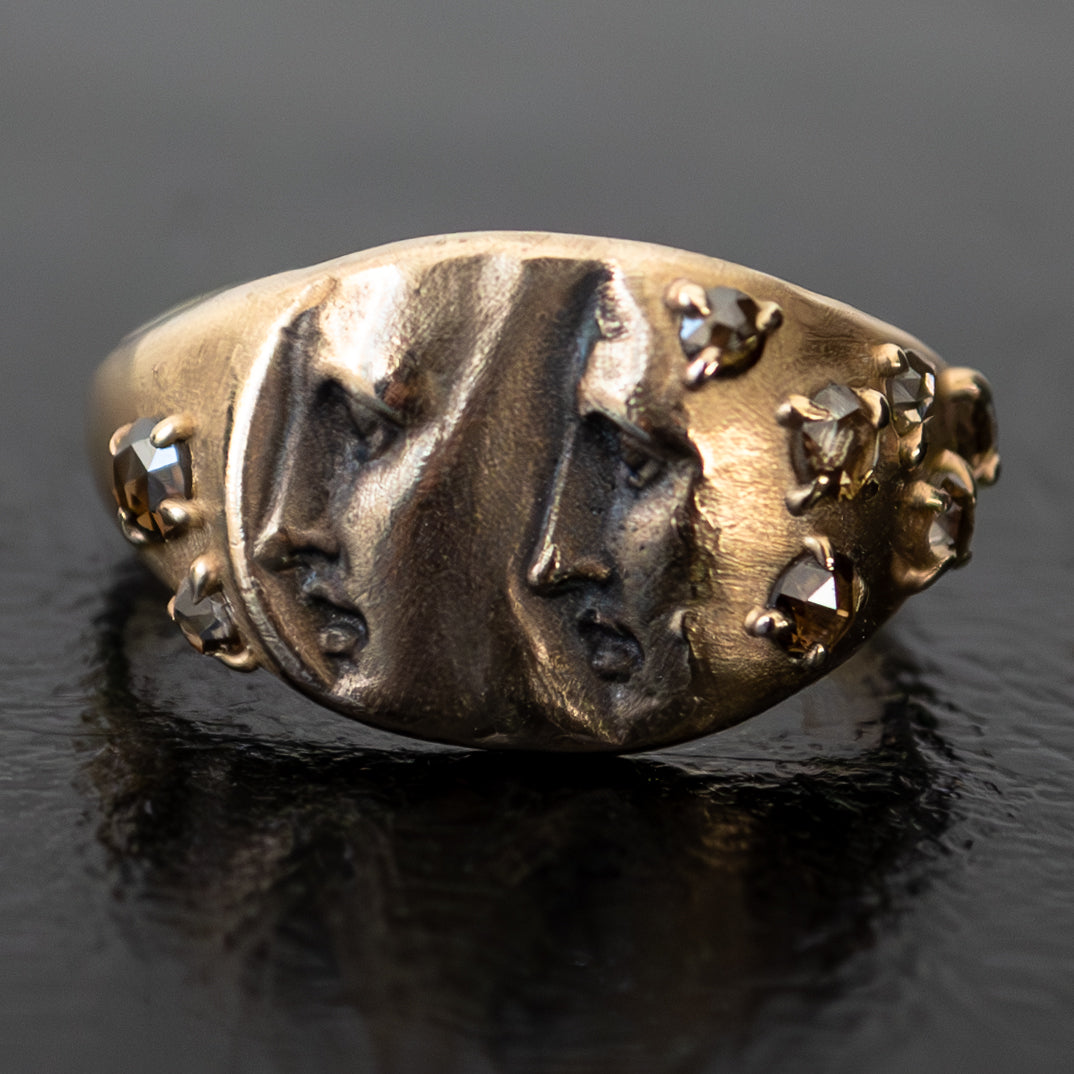 Sculptural matte gold commands attention with champagne diamonds of organic shapes and sizes. Two profiles carved side-by-side inspire self-reflection. Designed by Atelier Narcé as a wearable work of great art.