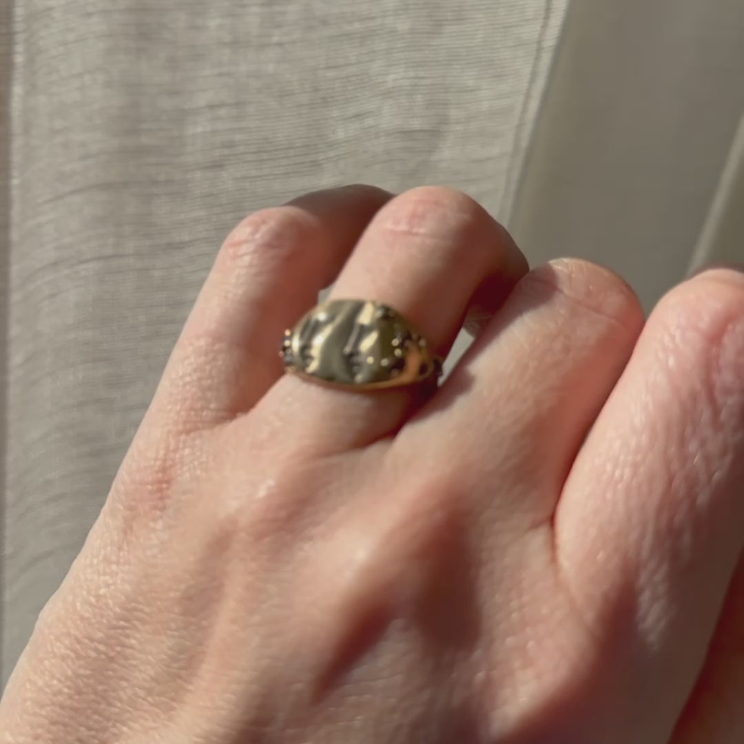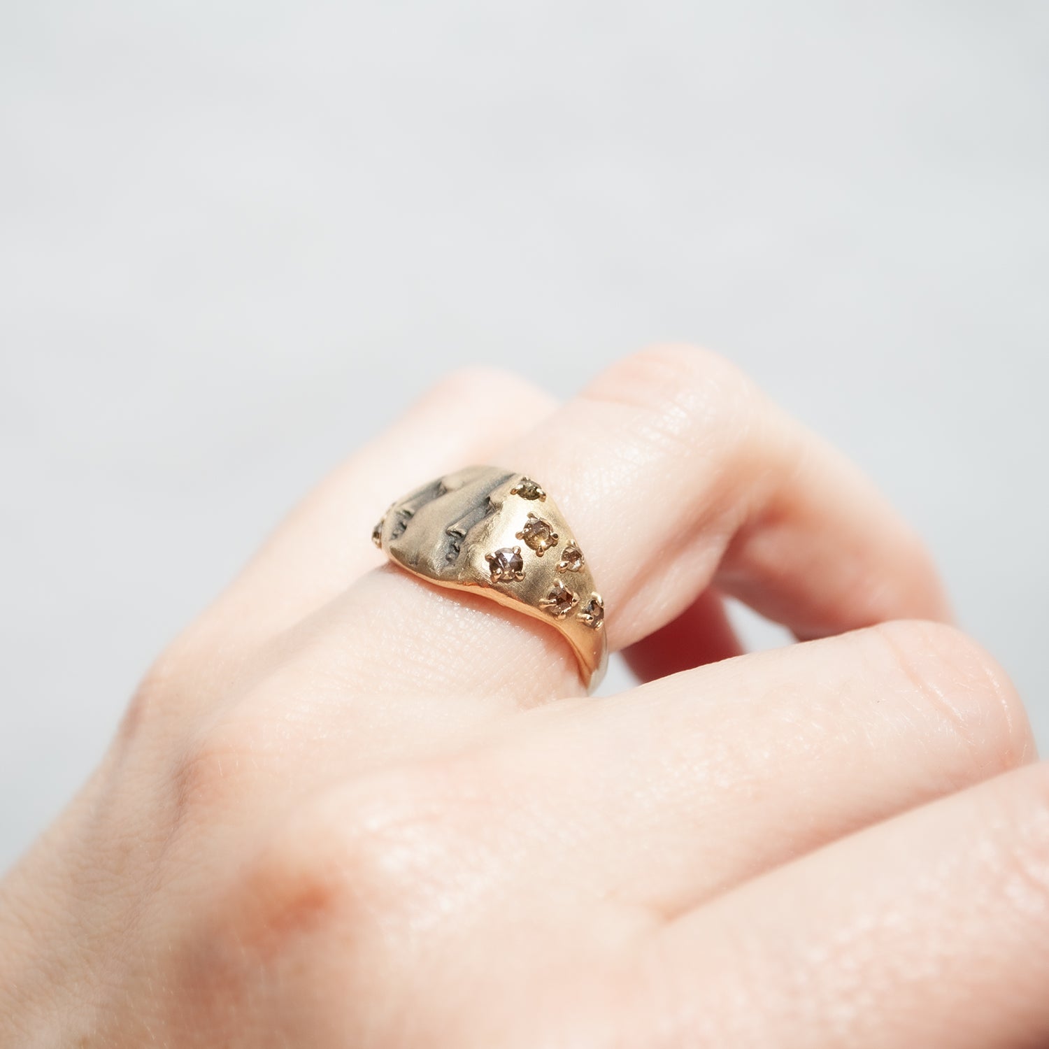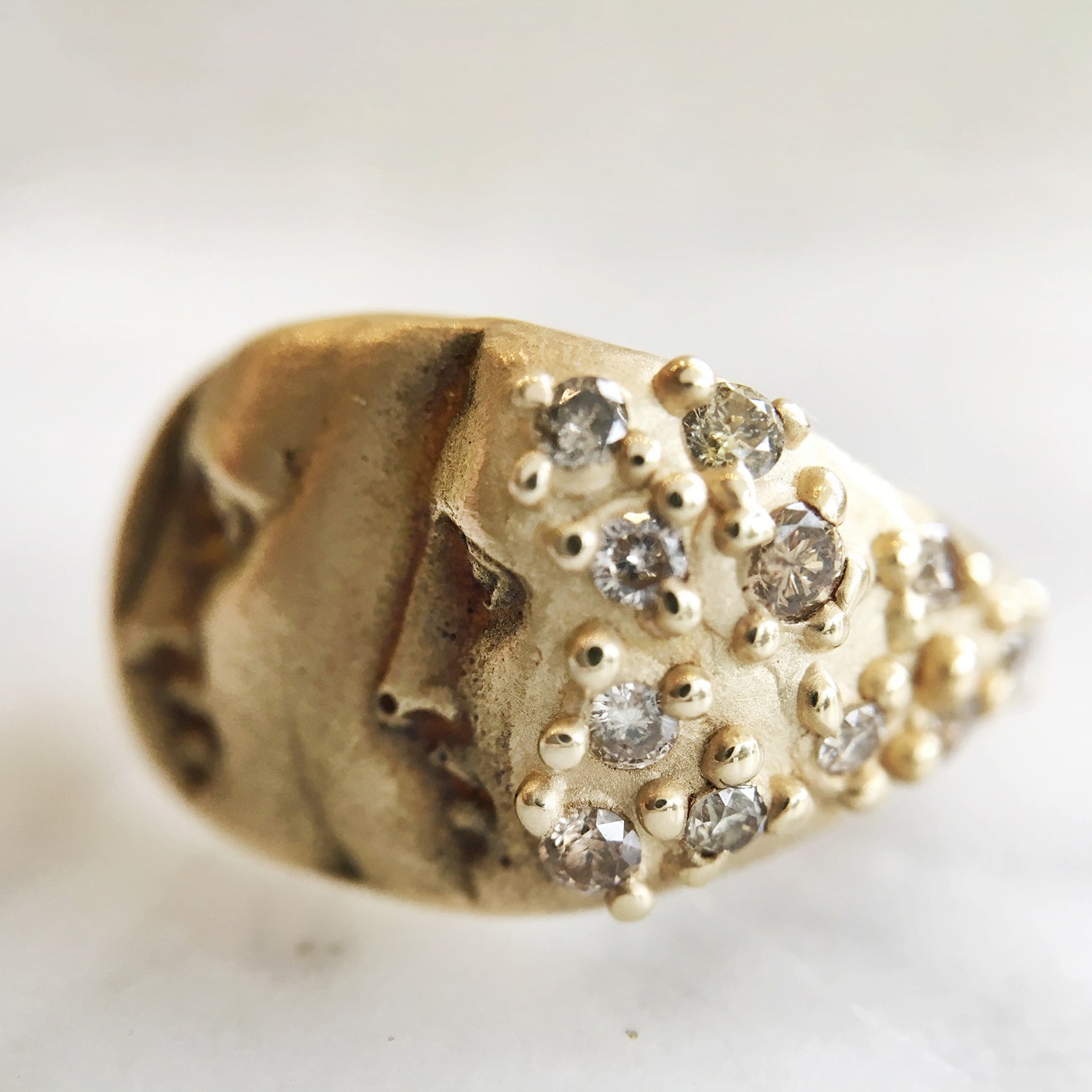 Sculptural matte gold commands attention with champagne diamonds of organic shapes and sizes. Two profiles carved side-by-side inspire self-reflection. Designed by Atelier Narcé as a wearable work of great art.