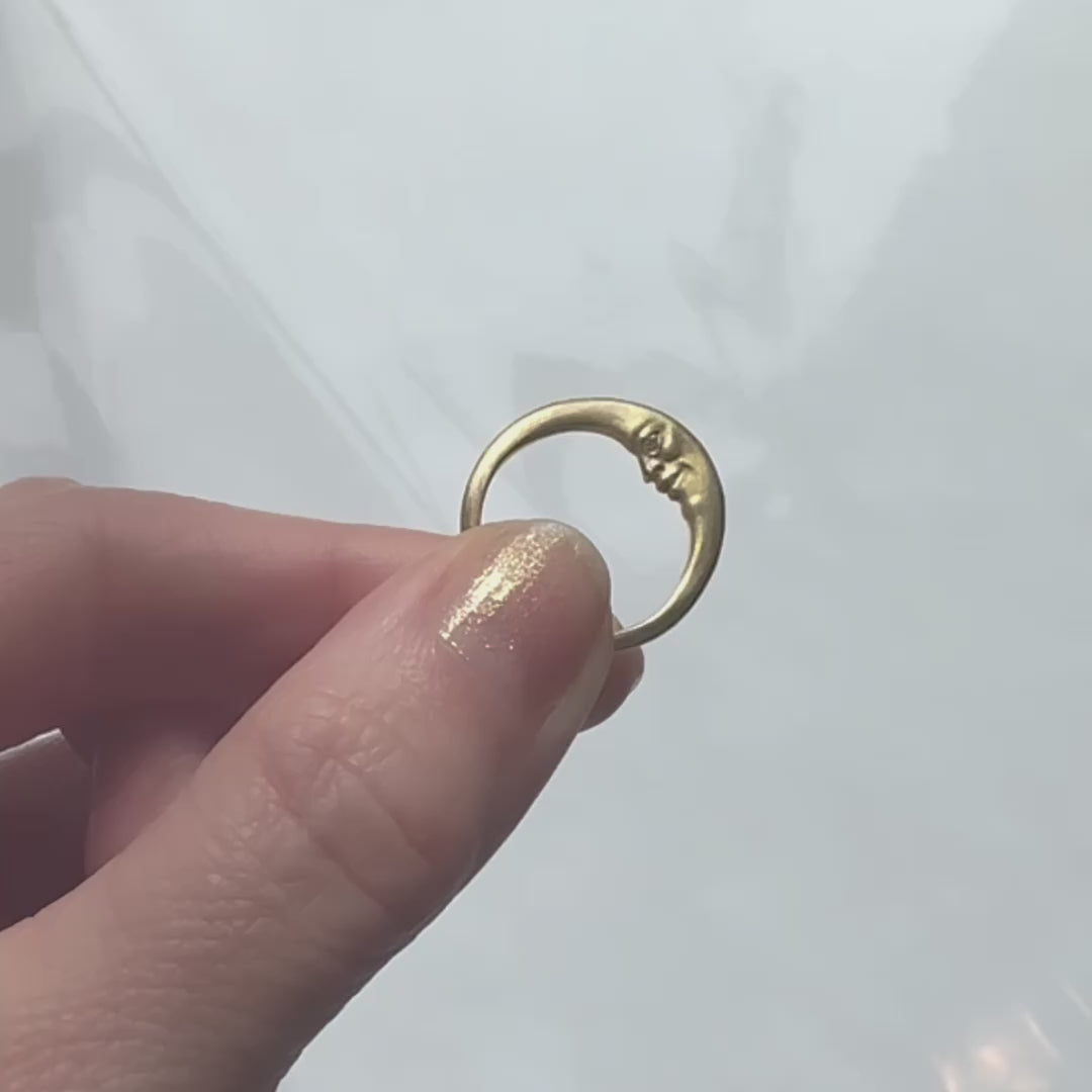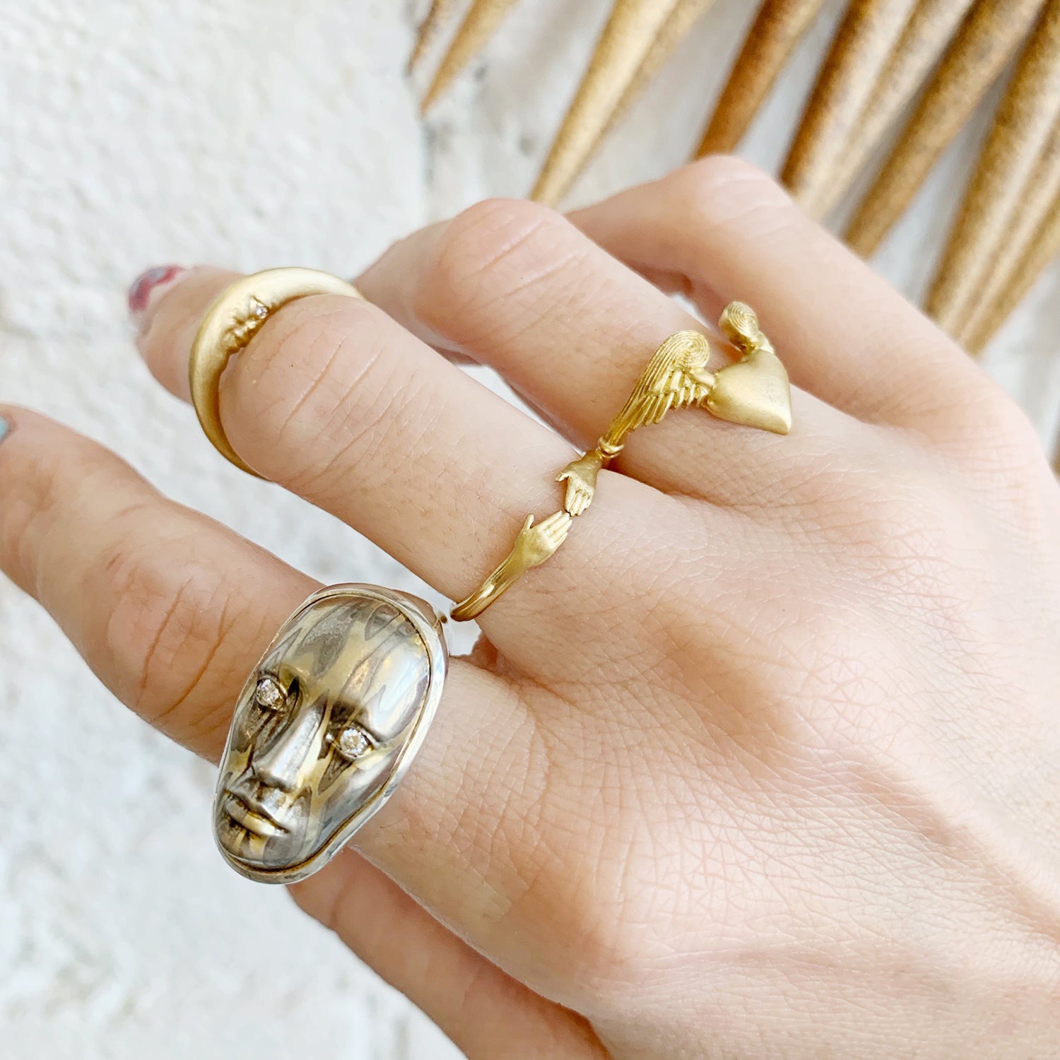 The Gold Crescent Moonface Ring from Anthony Lent has a sparkly white diamond eye. His realistic face and dreamy matte gold finish point to Anthony's fascination with Renaissance astronomy and how art and science combine. This piece looks especially great layered with other celestial rings.