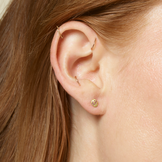 - SMALL GOLD HUGGIE HOOPS by ESQUELETO ESSENTIALS: Small solid 14k yellow gold hoops that can be worn in multiple locations on the ear