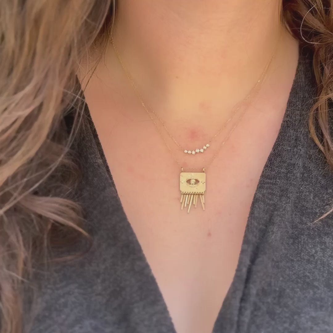 Bright diamonds and white sapphire spark universal beauty around an intricate eye shape. This entire pendant is cast in 14k gold, including the flowing fringe at the bottom. Crafted by Celine D'Aoust to symbolize wisdom and strength.