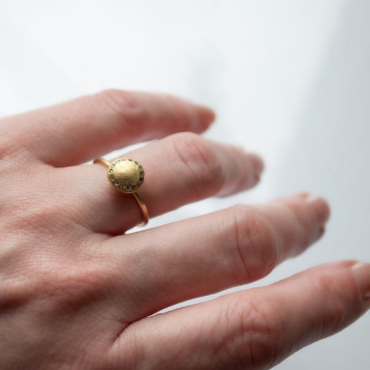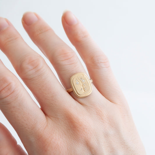 - Till Death Diamond Ring by MAKIKO WAKITA: 14k yellow gold ring featuring seven white diamonds and the phrase “Je meurs ou je m’attache”