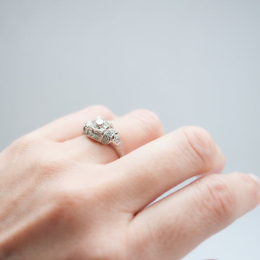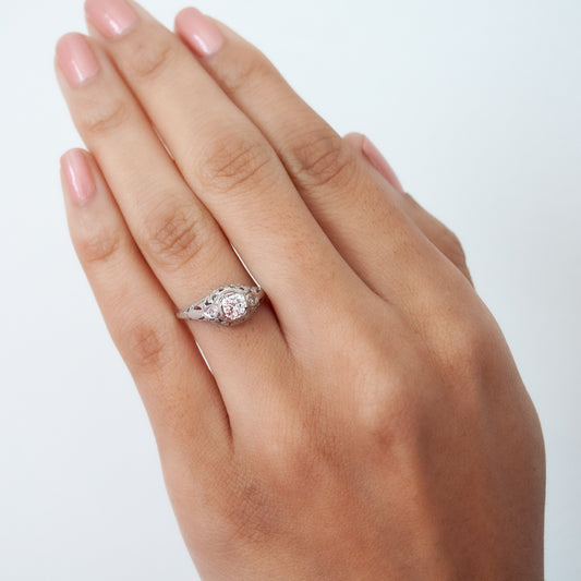 Art Deco Filigree Diamond Ring by VINTAGE: Vintage setting of 18k white gold cradling a .40ct European-cut white diamond surrounded by a crisp Art Deco design
