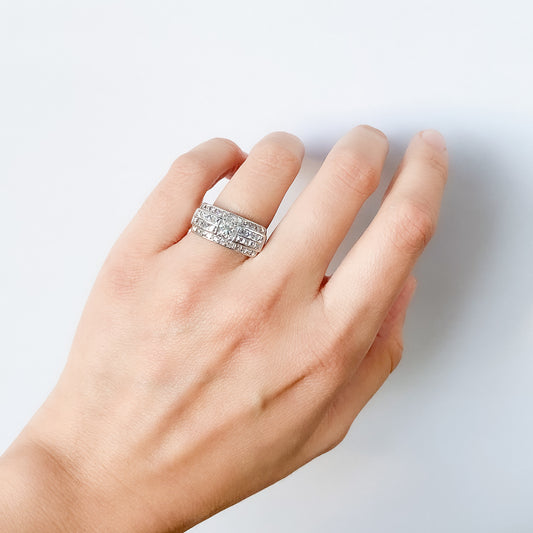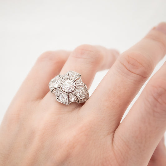 Art Deco Diamond Ring: Breathtaking 1920s platinum ring with a total of 25 white diamonds artfully arranged in a geometric Art Deco pattern