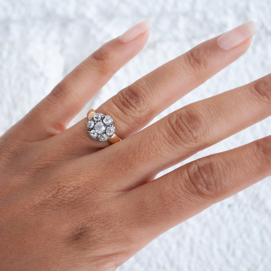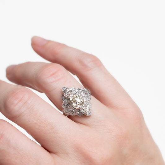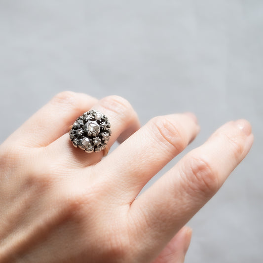 Deco Marquise Cluster Ring by VINTAGE: Tasteful blend of platinum and 18k white gold featuring a cluster of nine white round diamonds that sparkle as one