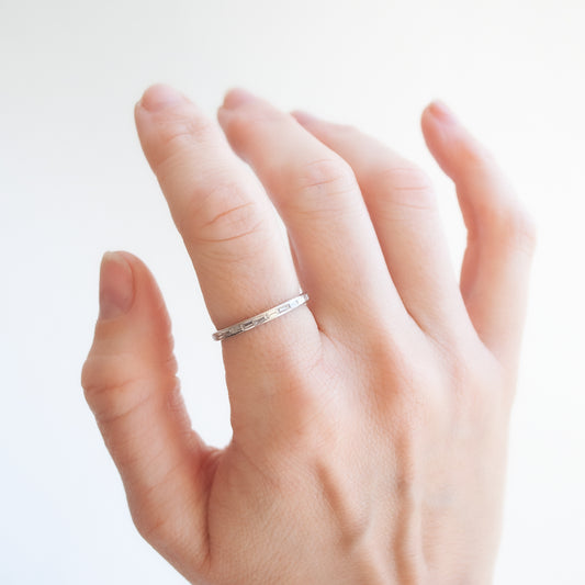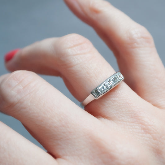 Platinum Five Diamond Bar Ring by VINTAGE: Five white, square-cut diamonds cast in a pure platinum setting with a modern yet classic feel