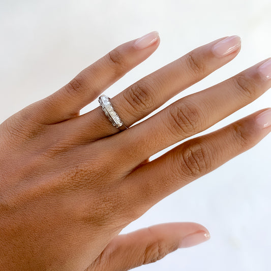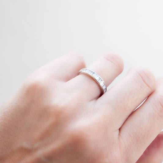 Platinum Baguette Eternity Band by VINTAGE: Thick, decadent platinum eternity band lined with 31 white, straight-cut baguette diamonds