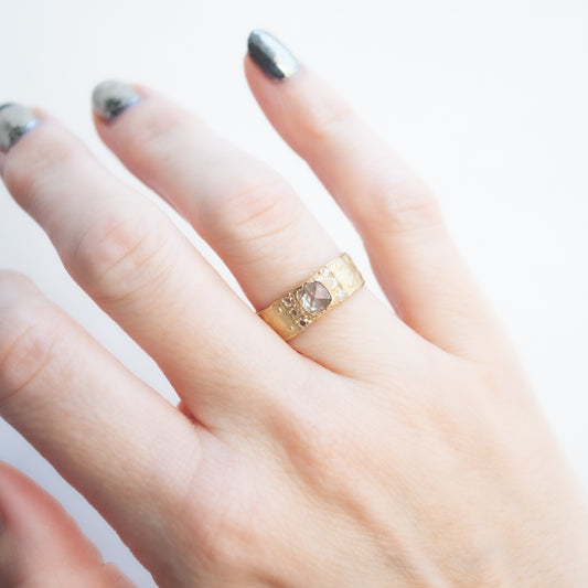 LXCI Molten Gold Band by ELLIS MHAIRI CAMERON: A wide molten gold wedding band with a timeless look and hand-forged texture