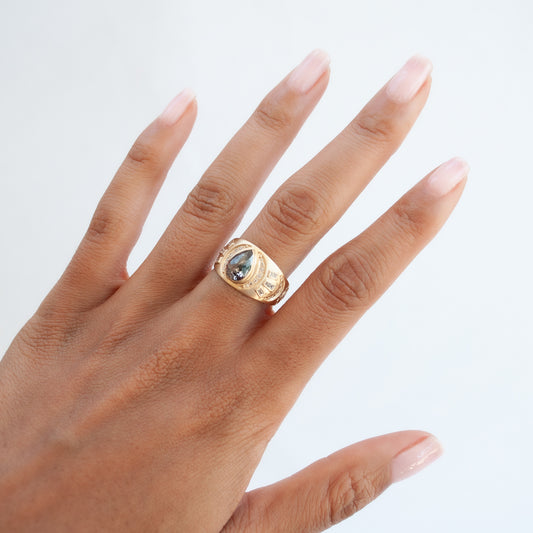 Deco Eye Diamond Signet by KIMA FINE JEWELRY: A salt and pepper diamond surrounded with a white diamond halo set in spotless 14k yellow gold