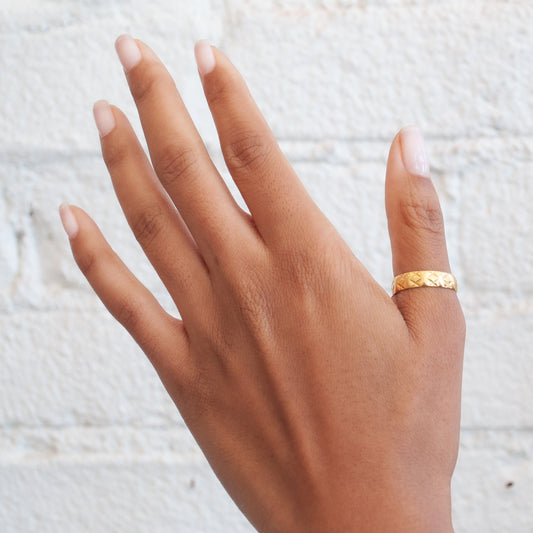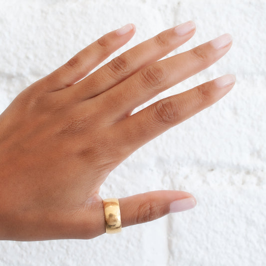 LXCI Molten Gold Band by ELLIS MHAIRI CAMERON: A wide molten gold wedding band with a timeless look and hand-forged texture