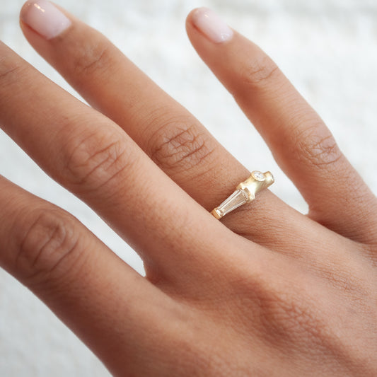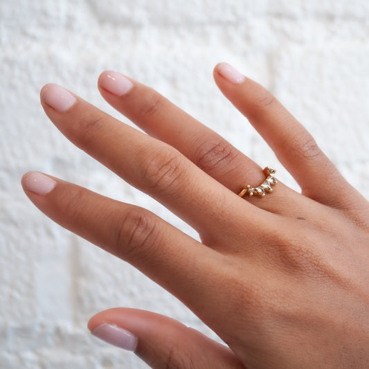 Gracia White Diamond Ring by LADHA: Timeless white diamonds set in a slightly angled 14k yellow gold wedding band