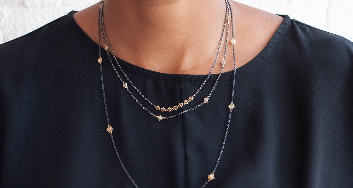 Drawing inspiration from the natural landscapes and vibrant textiles that colored her travels, Sara Freedenfeld set out to create a line of jewelry that delicately unites the natural simplicity of handcrafted artistry with the sophistication and glamour of high fashion. "I am very inspired by textiles, and many of my pieces have a fabric-like sensibility, which I create by intricately weaving chains and stones to create rich textures. Every piece is handcrafted by me and my small team in our studio." The name 'AMALI' comes from her bold, confident grandmother who embodies the spirit of the brand.