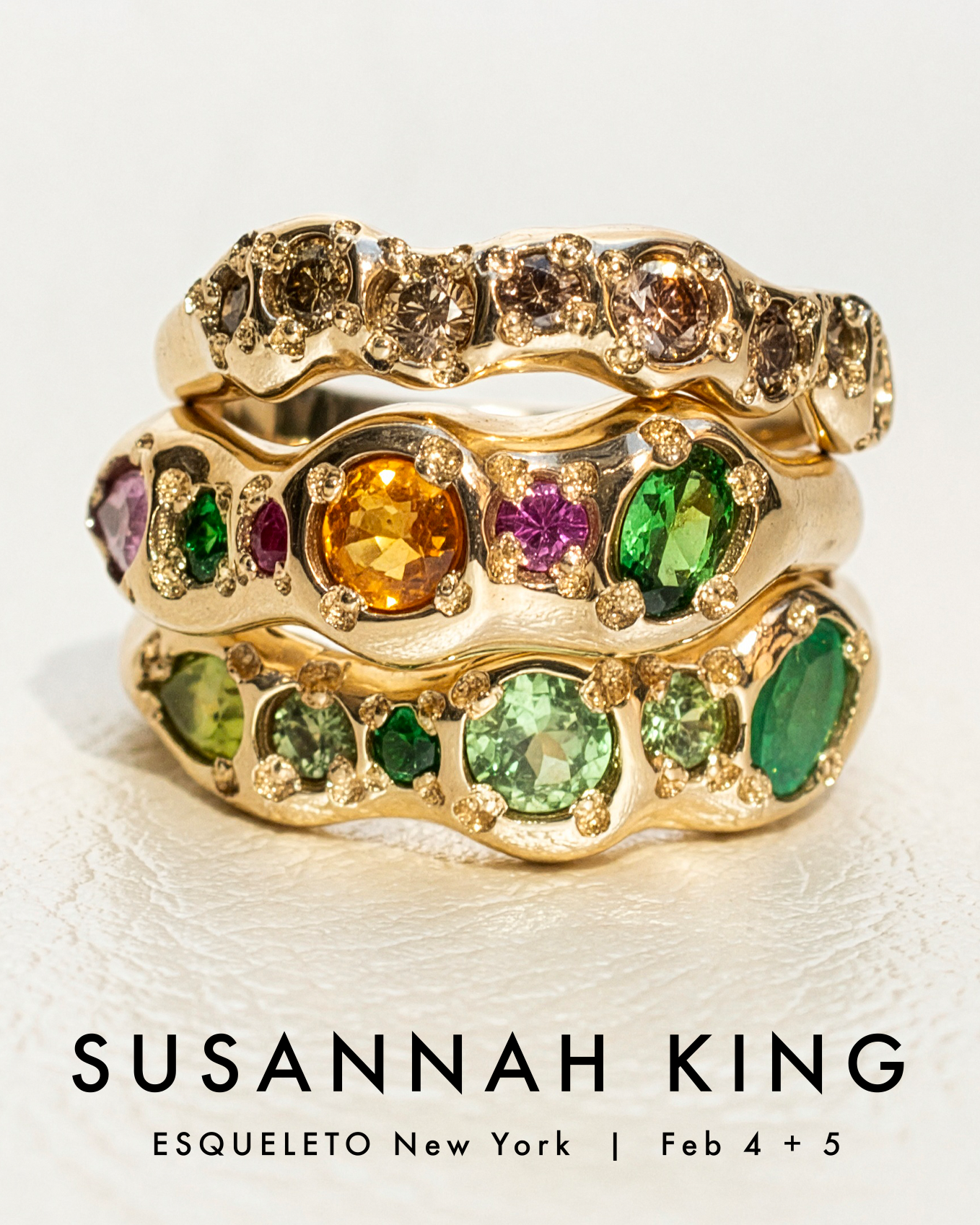 CLICK FOR MORE INFOWe are thrilled to welcome English jeweler Susannah King to the states for her first ESQUELETO trunk show! Susannah will be be here in person with so many very special one-of-a-kind pieces and uniquely creative designs for a 2-day pop up shop in our New York City boutique. Come by to meet the incredible designer and shop her entire colorful collection!