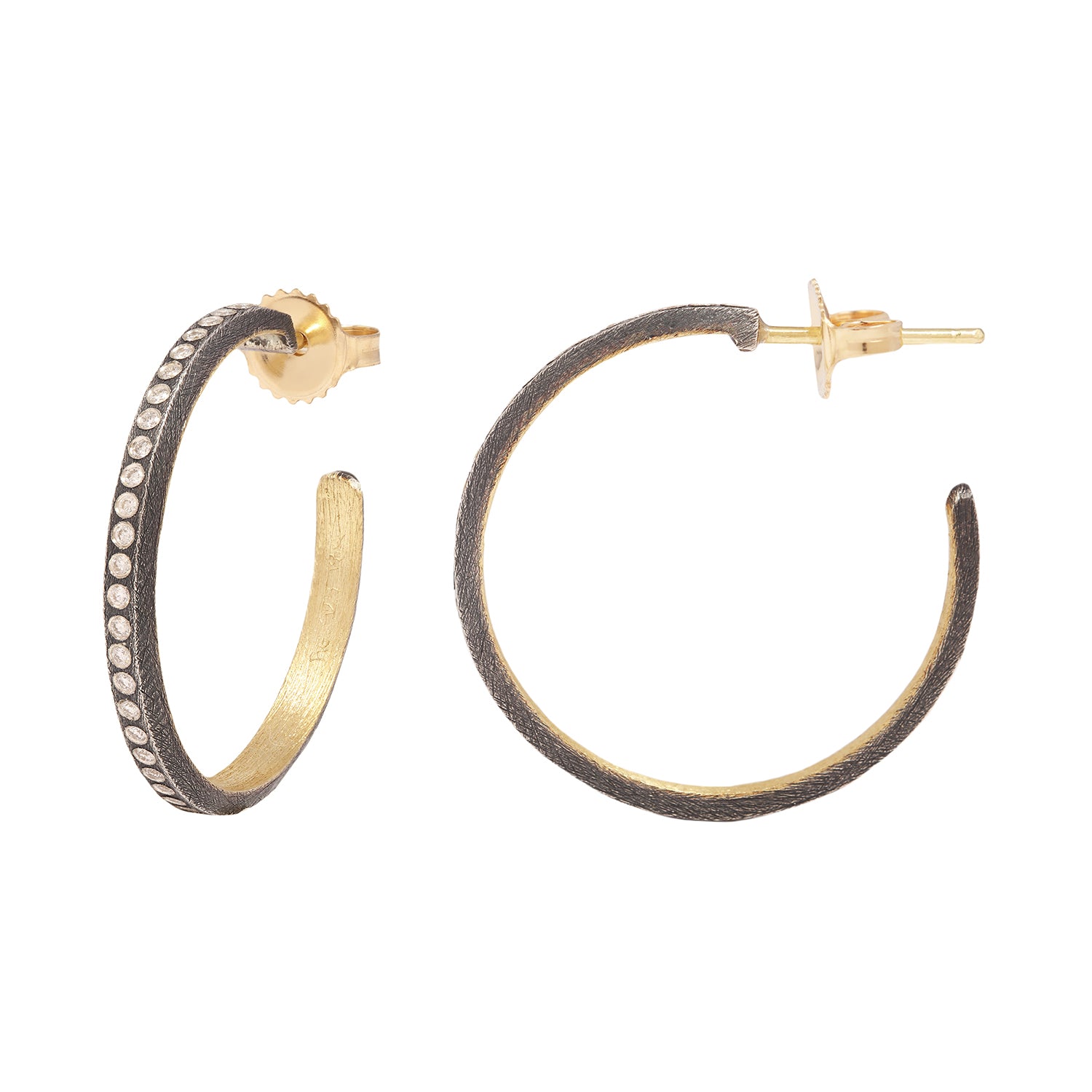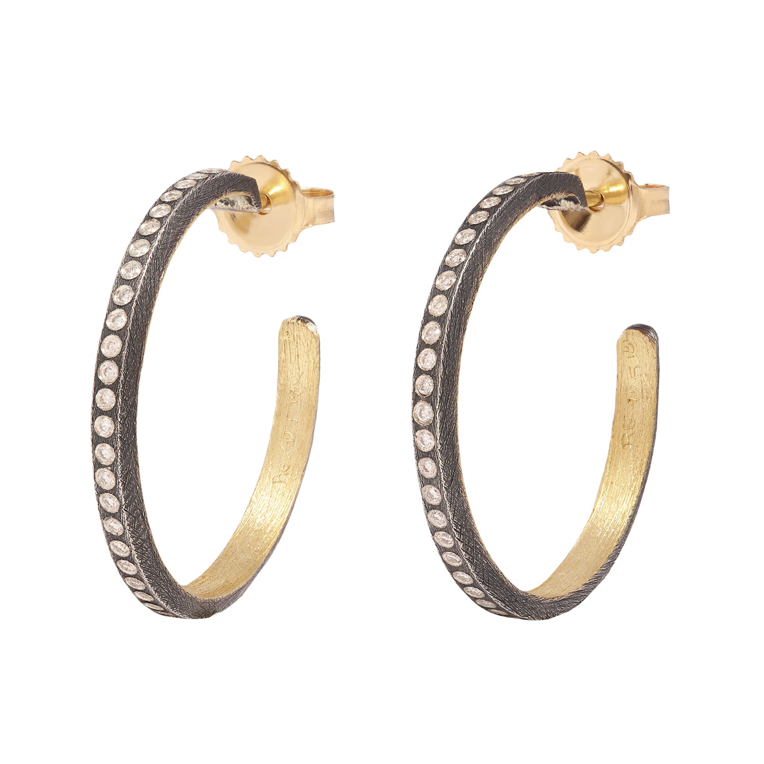These luminous hoop earrings from Rene Escobar enhance any ensemble with their elegant fusion of gold, silver, and diamonds, delivering a sophisticated touch of luxury. Sold as a pair.