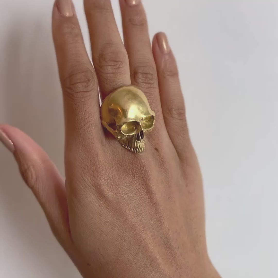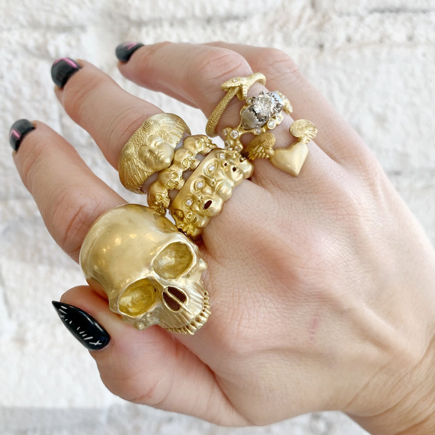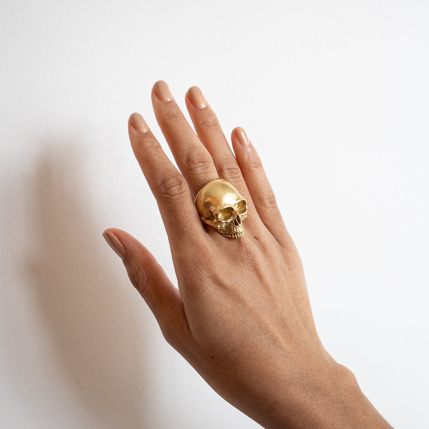 This massive 18k yellow gold skull ring is the ultimate in memento mori jewelry. The hyper-real details in gold bring ultra-luxe beauty to the badass aesthetic. From the master of the macabre, Anthony Lent.