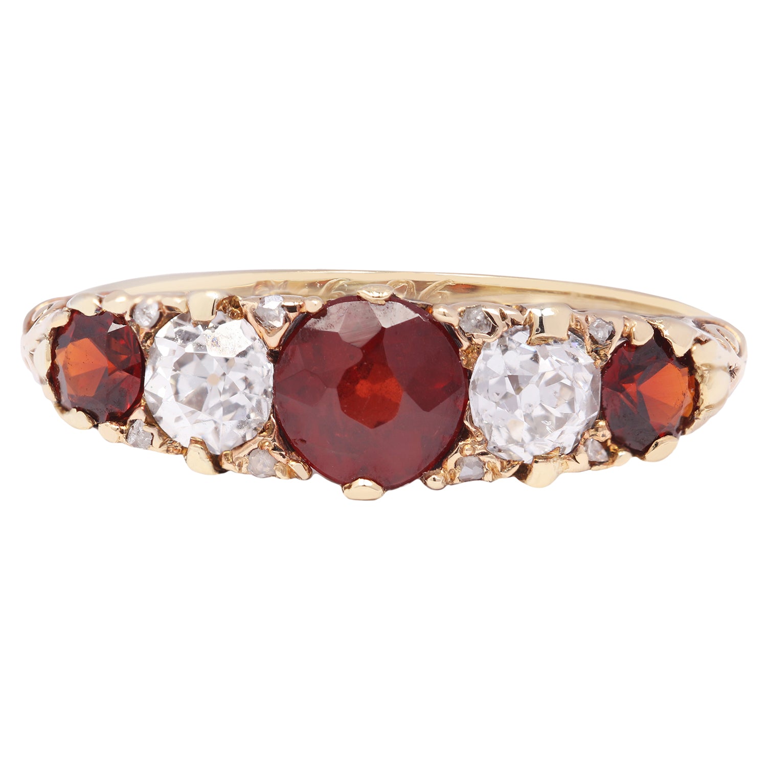 One of a kind antique garnet and diamond half hoop ring from 1906. It has a date engraved on the inside of the band, 21.6.06. A stylish turn-of-the-century 5 stone ring, adorned with three striking red garnet alternating with chunky old cut diamonds. The gallery boasts intricate scrolled filigree detailing that extends around the shoulders and the entire mount is expertly crafted from 18k gold.
