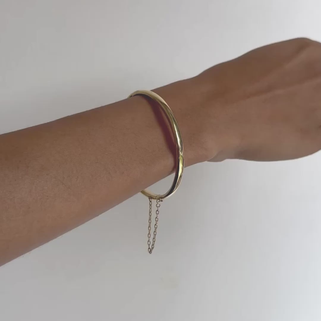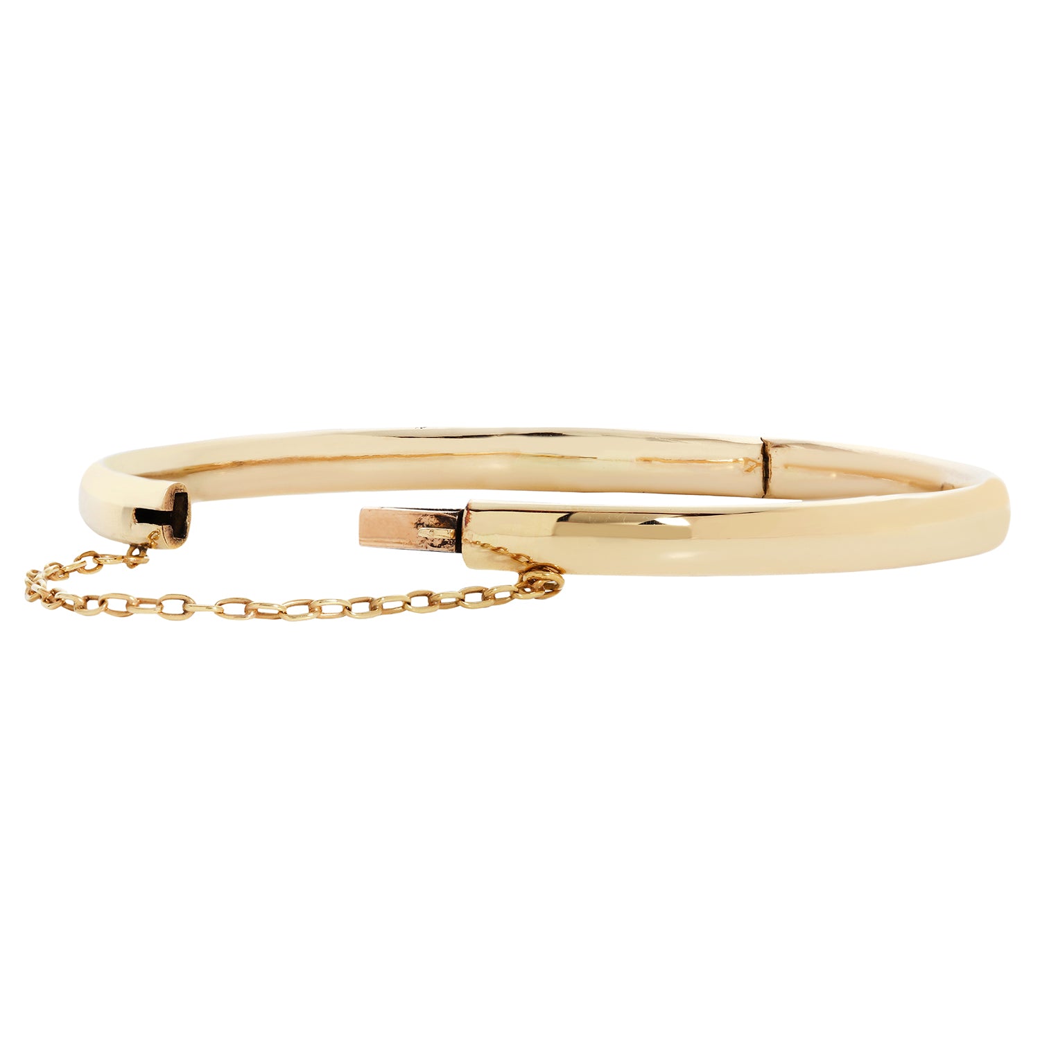 High on shine and polished to perfection. Our Antique High Shine Bangle is from the early 1900's and made of 15k yellow gold. This one-of-a-kind bangle is hollow and has an attached safety chain with a side hinge, making it super easy to put on and take off.