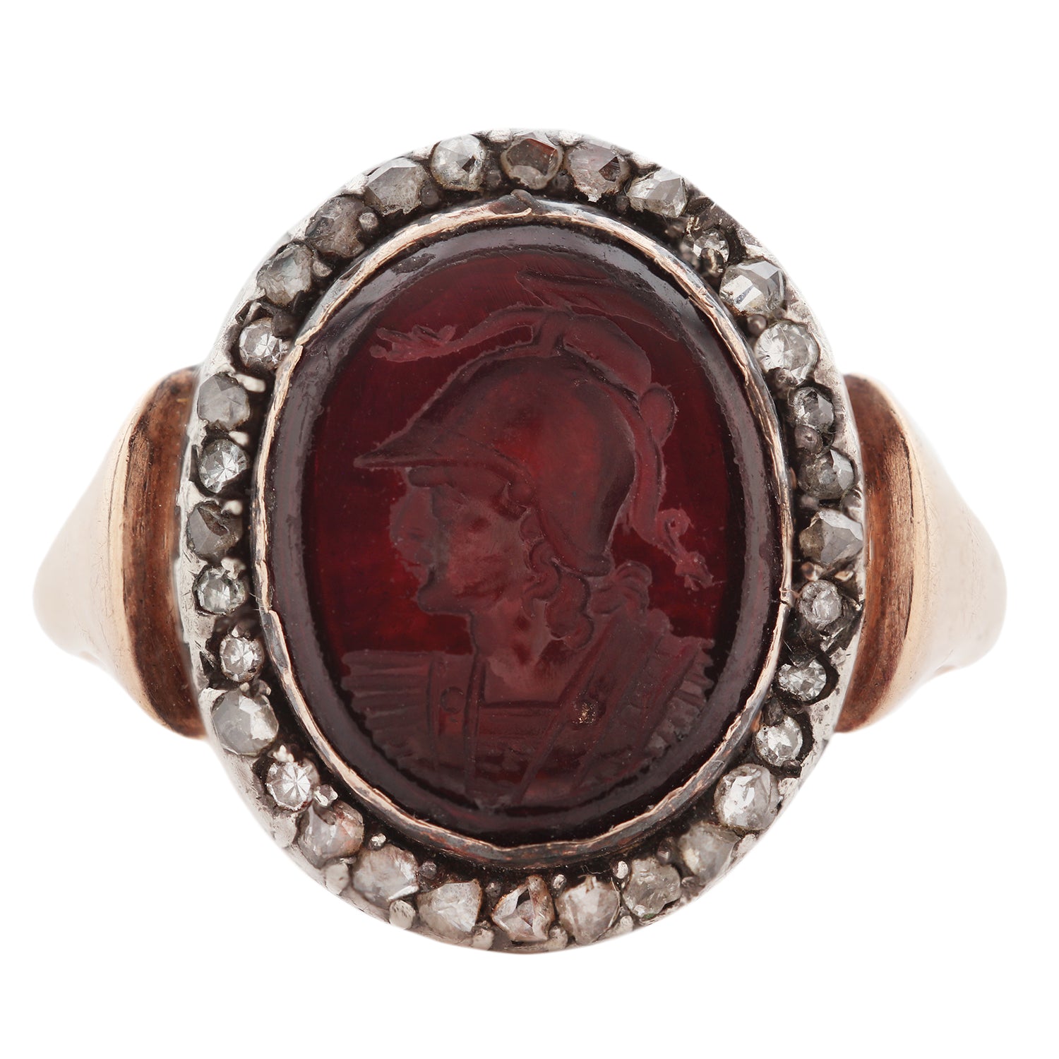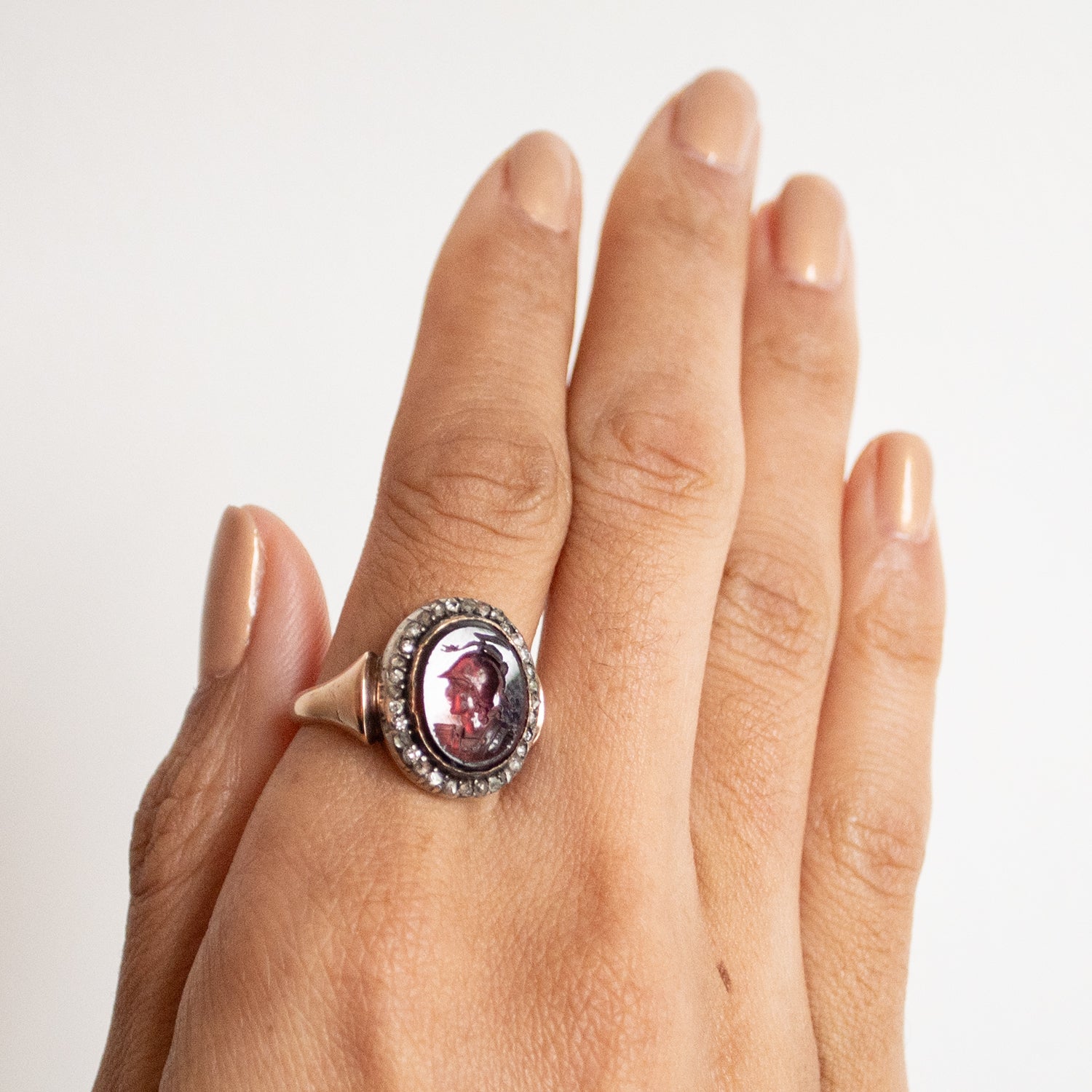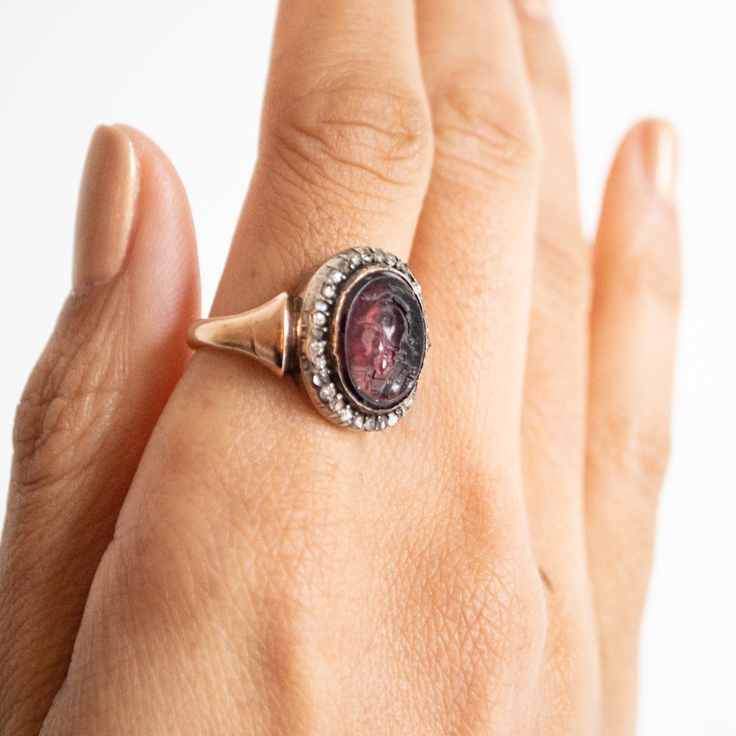 Our Antique Minerva Intaglio Ring is incredibly rare and rich in history. The hand-carved intaglio is made of rhodolite garnet and depicts Minerva the goddess with a halo of diamonds. The intaglio hails from the 17th century, while the ring is Georgian from the late 1770s to 1830. The surrounding diamonds are silver set with gold underneath. Take extra care when wearing this ring, we advise to not get it wet. This ring cannot be resized.