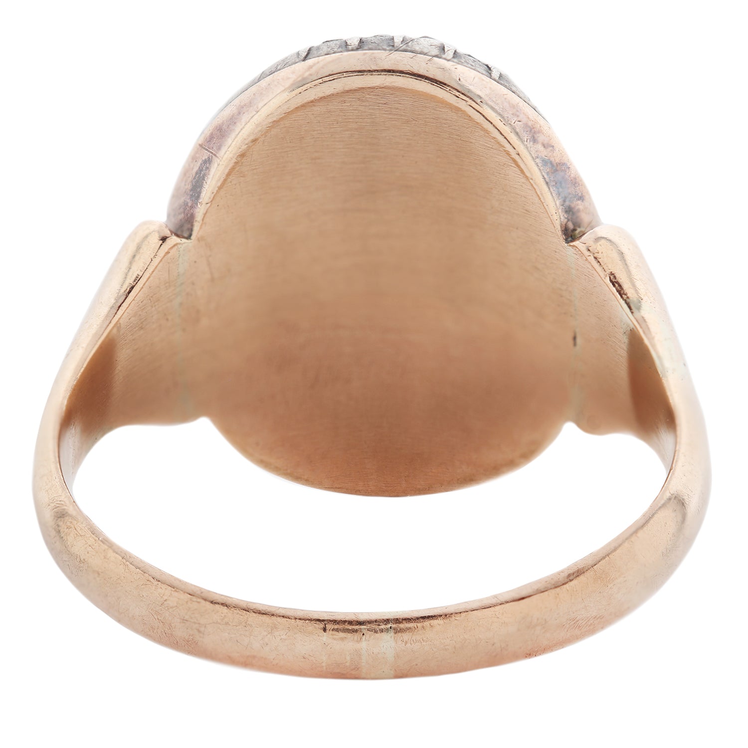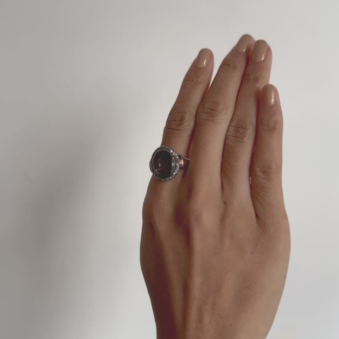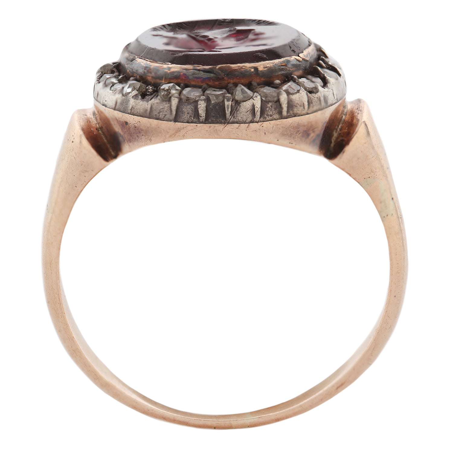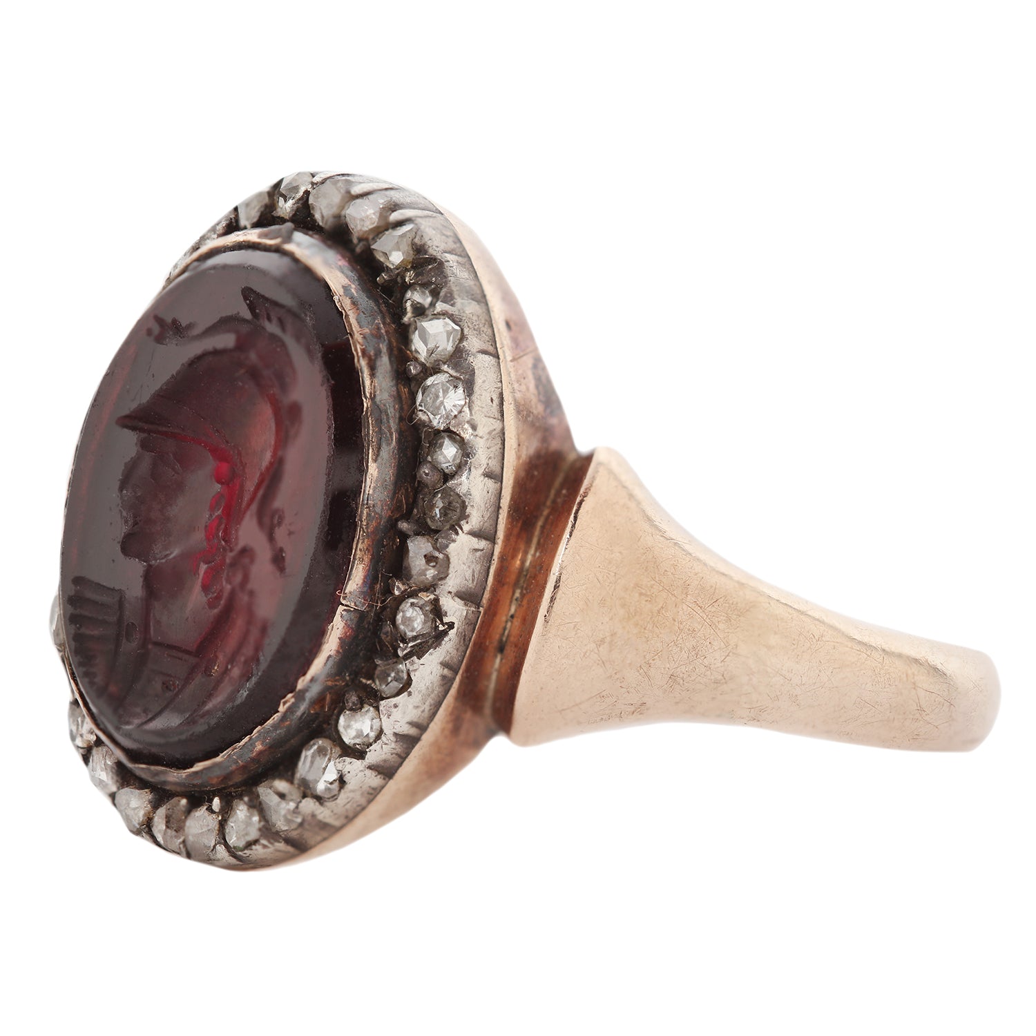 Our Antique Minerva Intaglio Ring is incredibly rare and rich in history. The hand-carved intaglio is made of rhodolite garnet and depicts Minerva the goddess with a halo of diamonds. The intaglio hails from the 17th century, while the ring is Georgian from the late 1770s to 1830. The surrounding diamonds are silver set with gold underneath. Take extra care when wearing this ring, we advise to not get it wet. This ring cannot be resized.