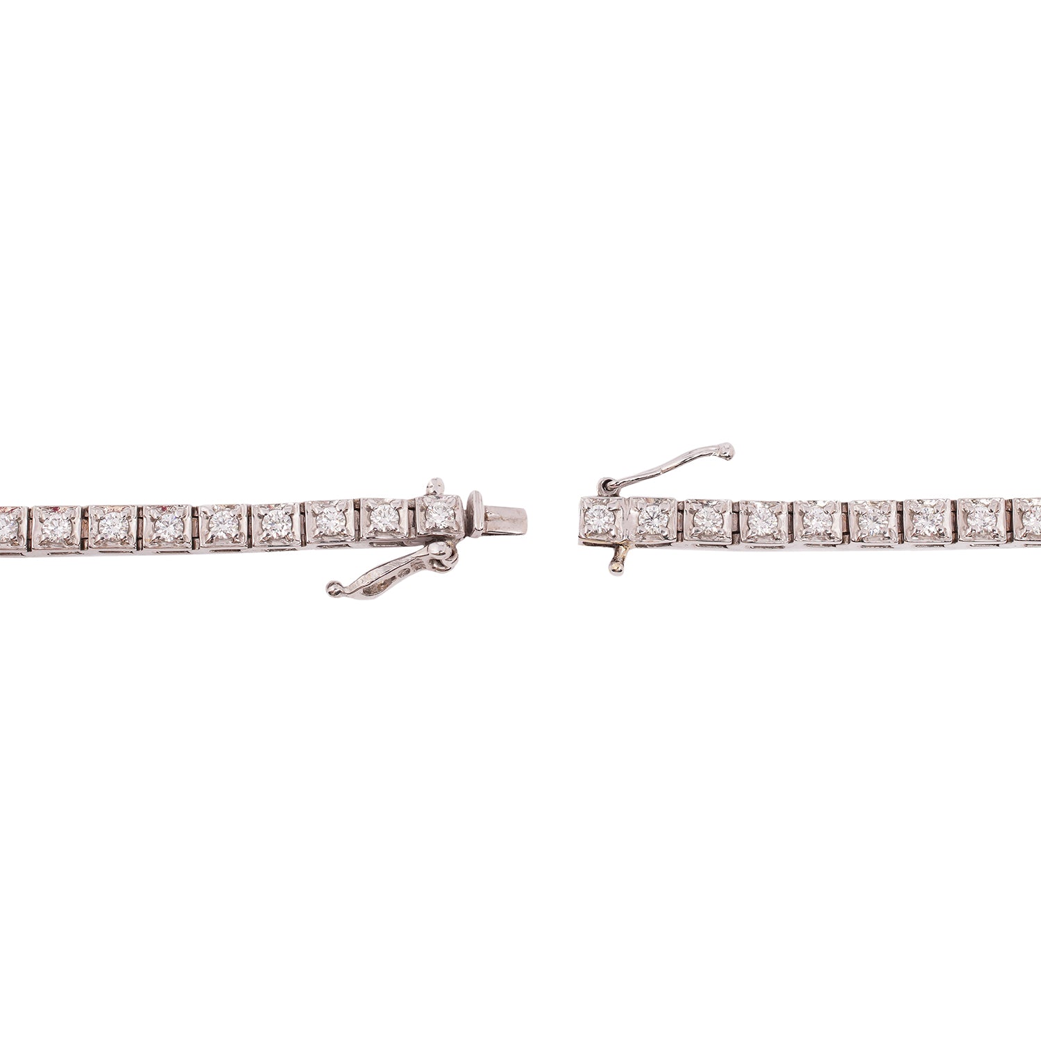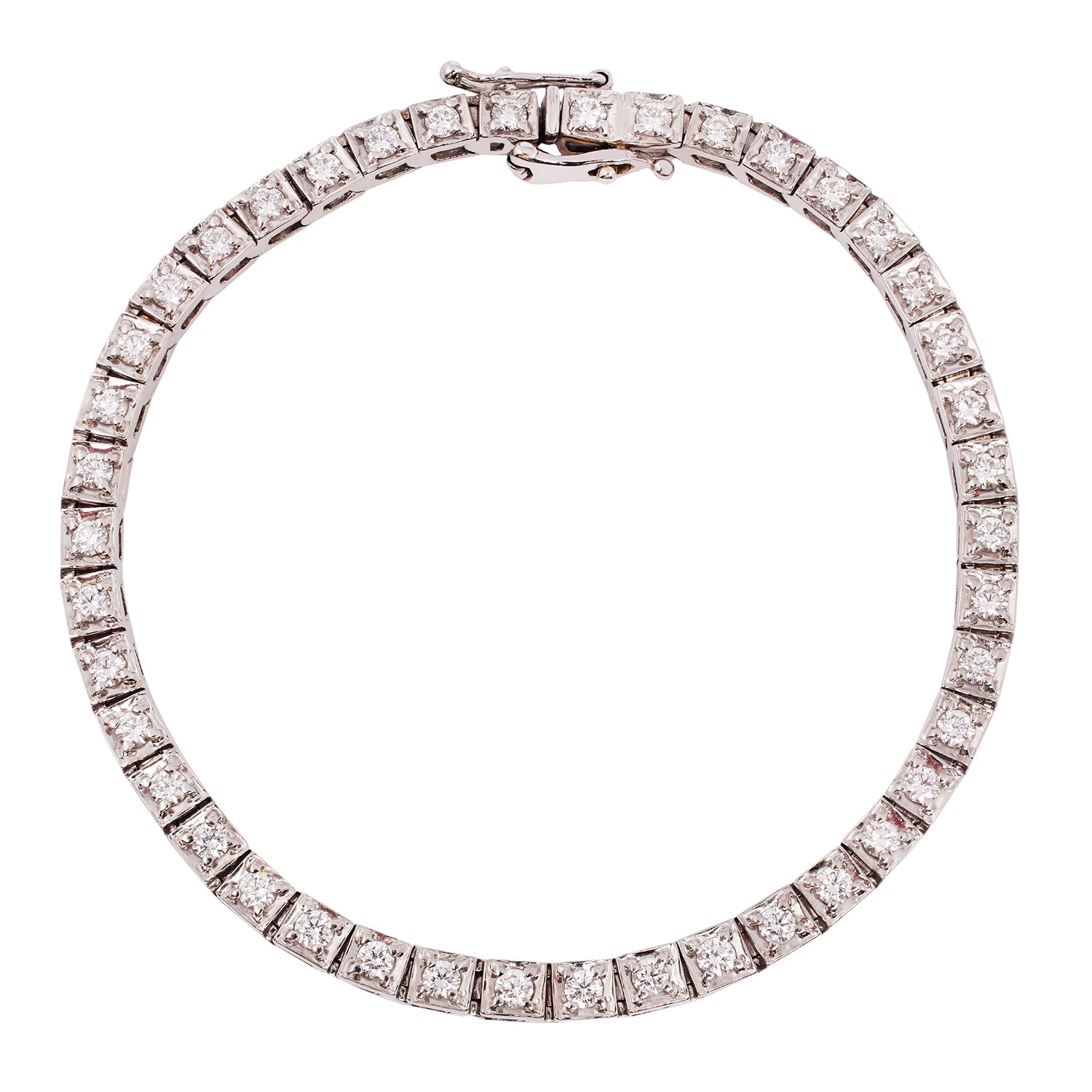 One of a kind, sparkle and shine. This vintage tennis bracelet features super-sparkly white diamonds in a block style bead setting. It hails from the 1950s and has a safety catch at the clasp. Appraisal available upon request.