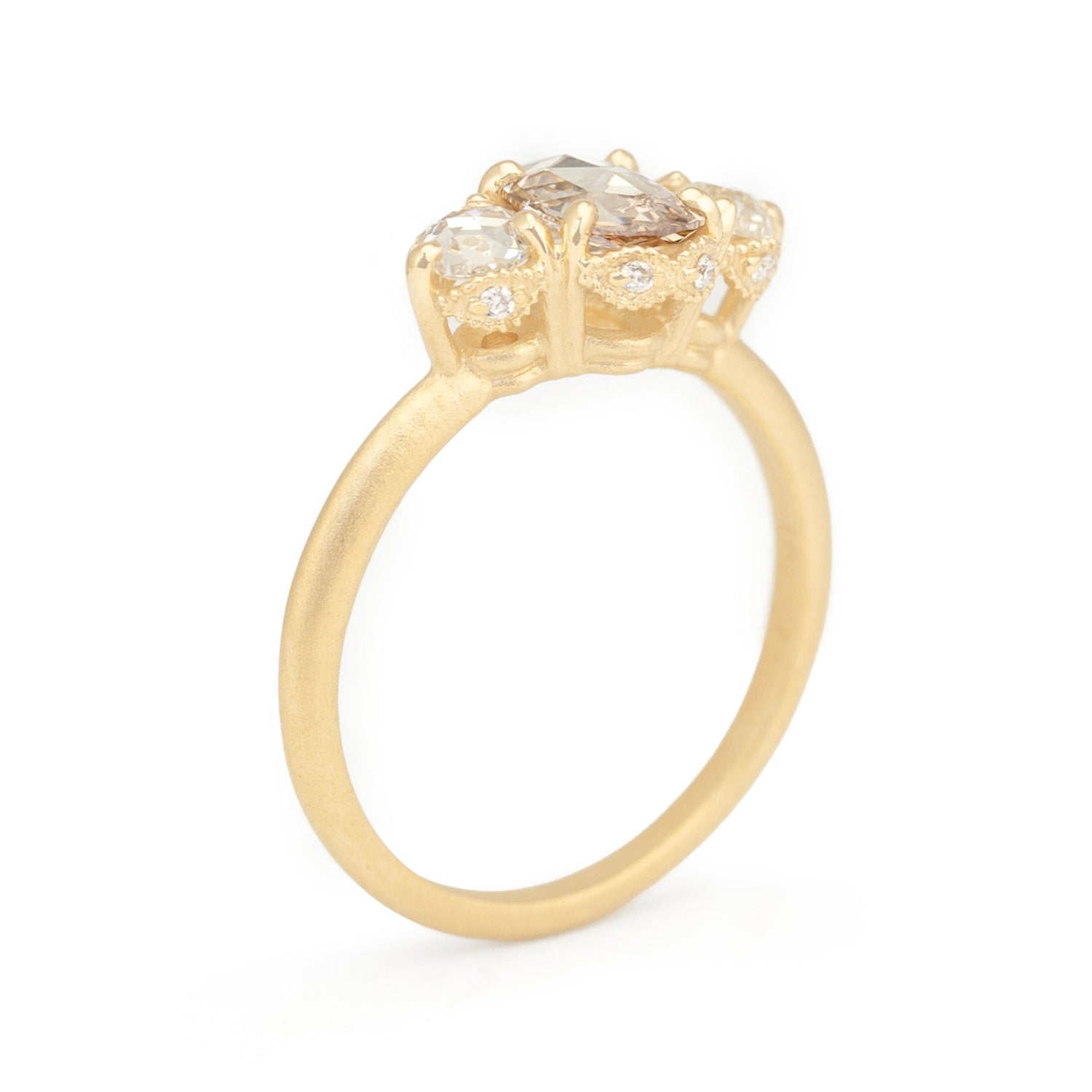This one of a kind three-stone design by Megan Thorne pairs a lightly golden brown diamond with luminous white rose-cut diamonds, all cradled within diamond-set ribbon scallops and a carved beaded edge. The vintage-inflected silhouette offers timeless sophistication.