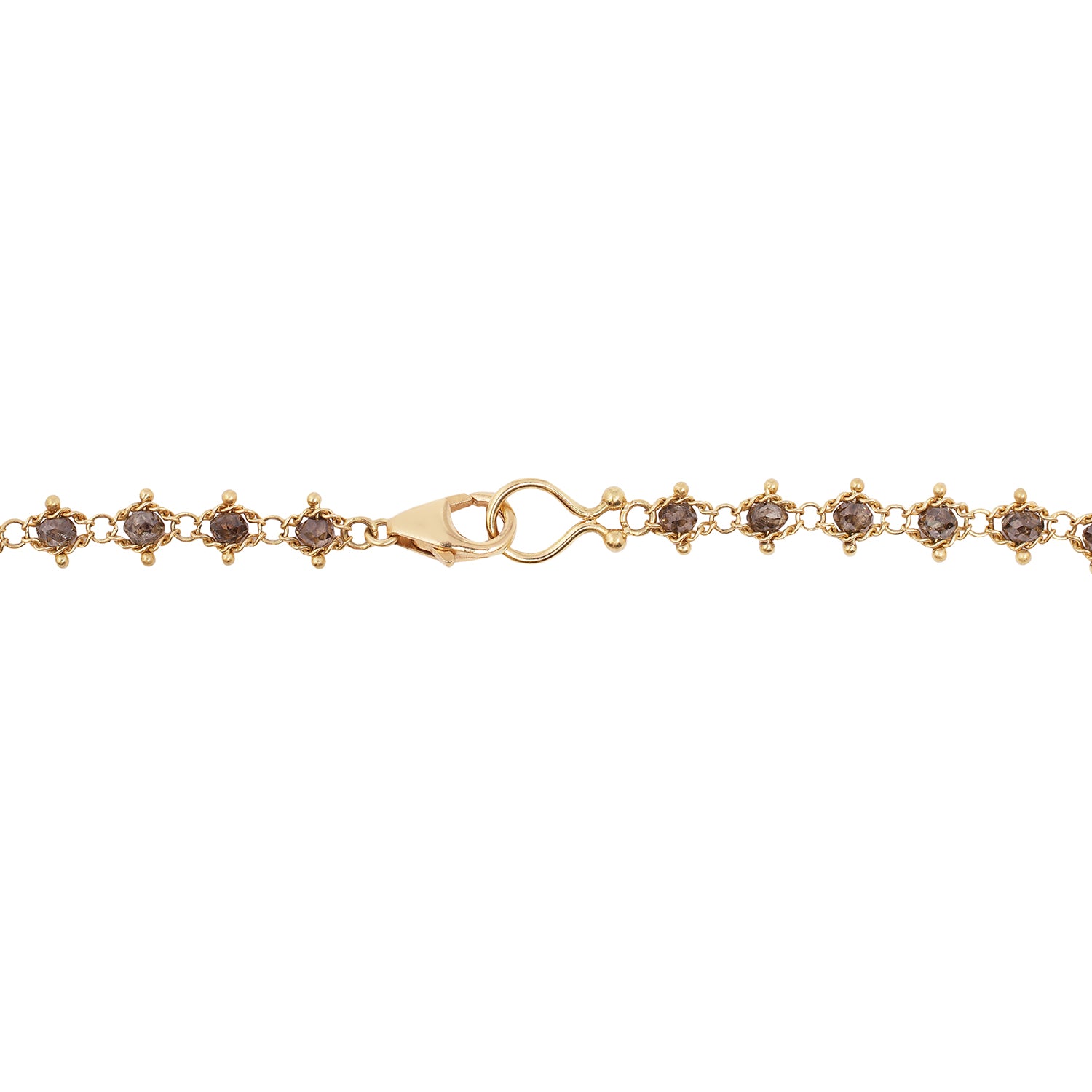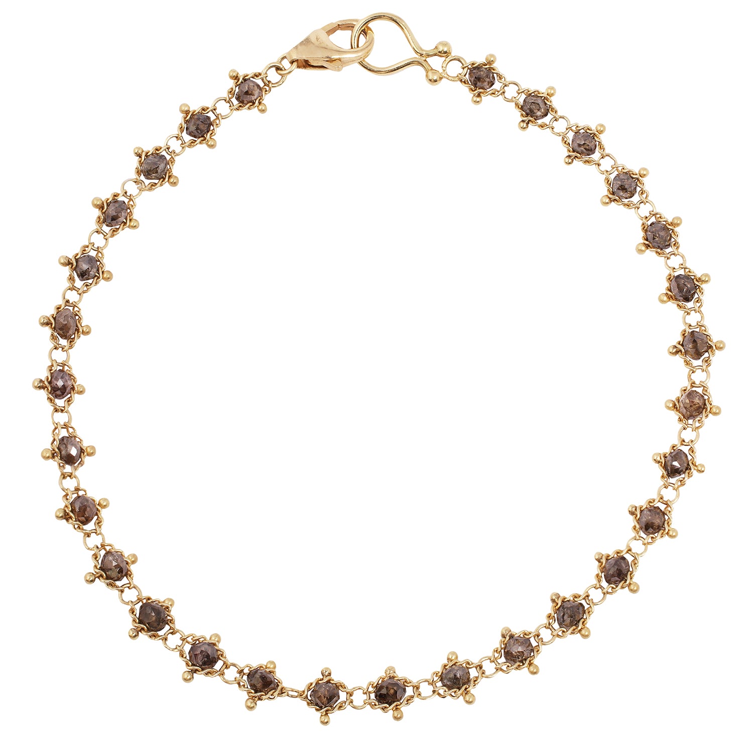 This exquisite bracelet showcases Champagne Diamond beads expertly hand-woven into an 18K yellow gold chain. Crafted by Amali, each bead is intricately linked to form a refined and luxurious design that highlights meticulous craftsmanship.