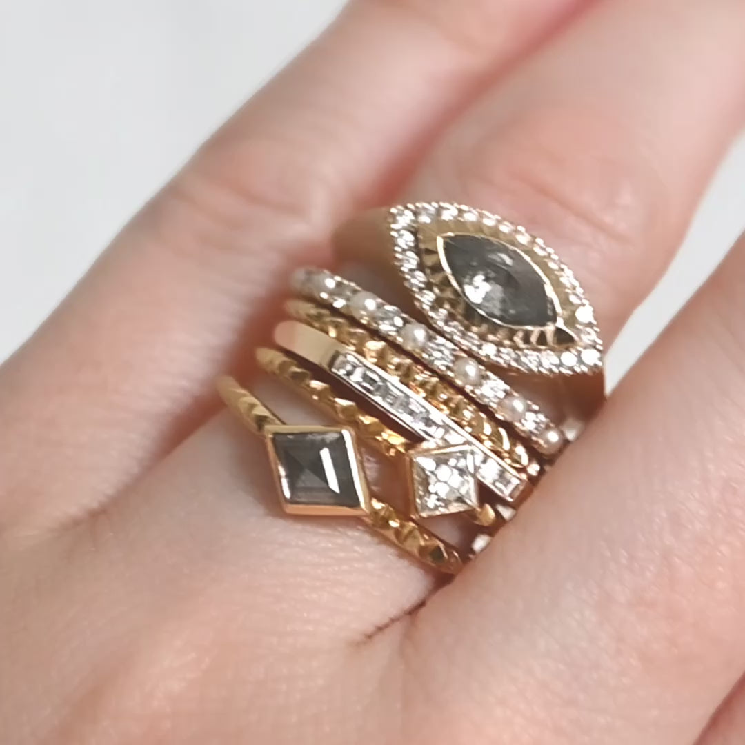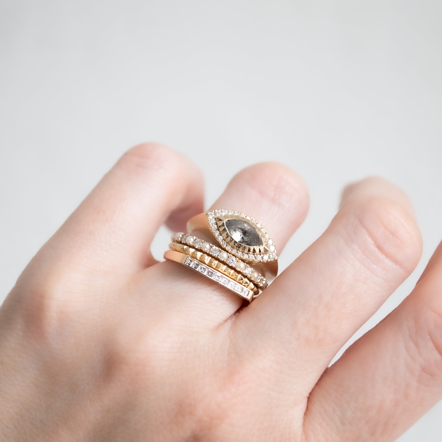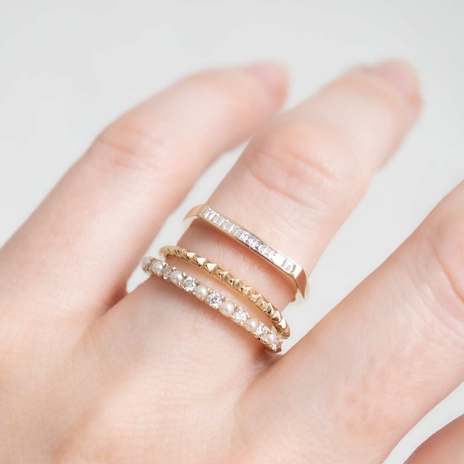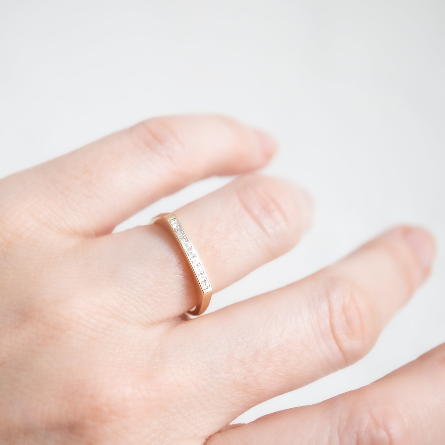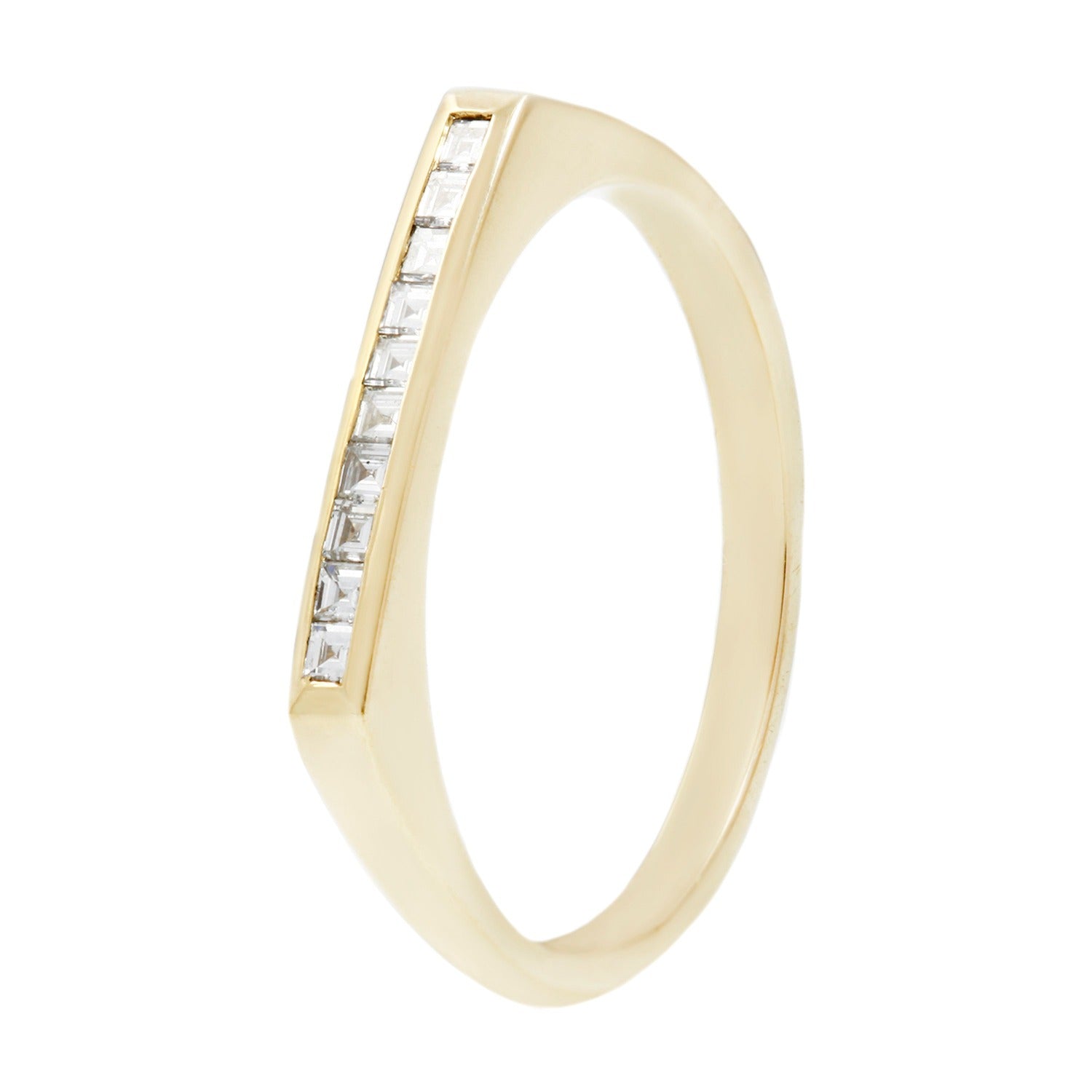 This 14k yellow gold bar ring boasts a channel of F/VS1 diamonds. The bright white stones are carré cut, a rare technique with a deco feel and fiery shine. Each stone is expertly cut and set by hand. Perfect for stacking or making a statement solo, we love the modern sleekness of this bar ring by KIMA Fine Jewelry.