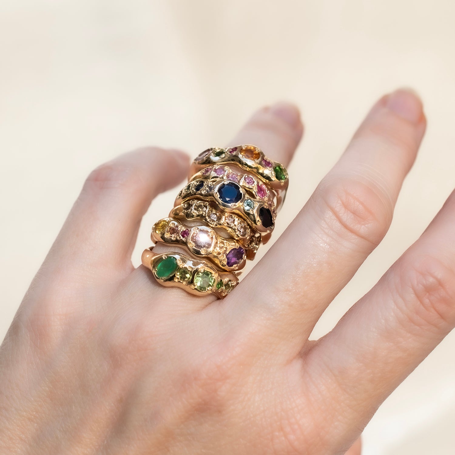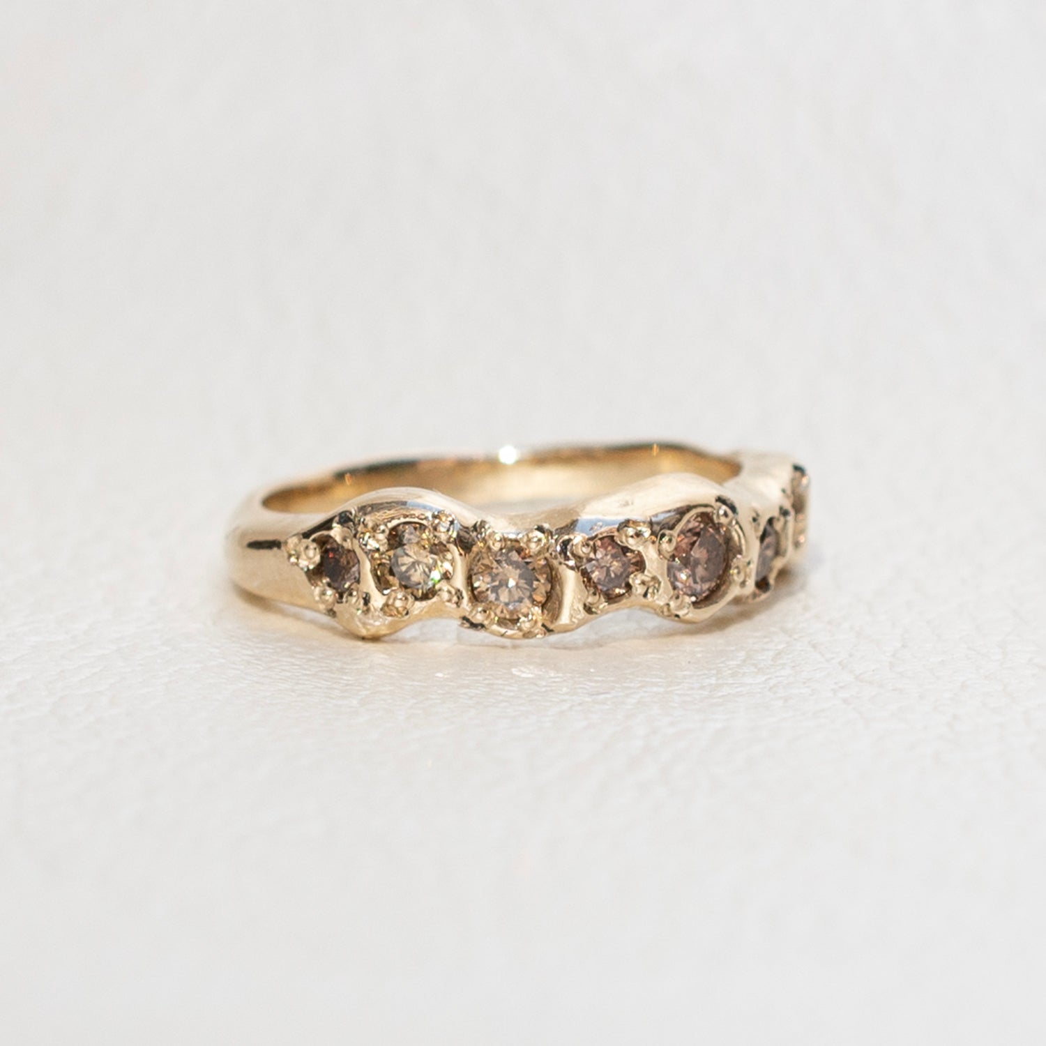 A narrow organic band peppered with light brown diamonds, this Susannah King ring is perfect for stacking. The rounded, undulating band is one of a kind and the warm gold will complement many other ring styles. Each piece is a singular expression of sculptural design and chromatic intensity.