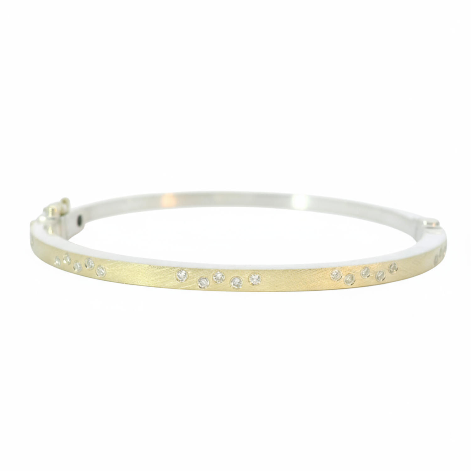 A signature piece by Rene Escobar, this slender bangle features 18k yellow gold and sterling silver with clusters of white diamonds arranged in a distinctive, playful pattern. The front is crafted in gold where the diamonds are set, while the back is finished in oxidized silver. It is secured with a gold push-lock clasp and safety hook, and expertly handcrafted by Rene Escobar.