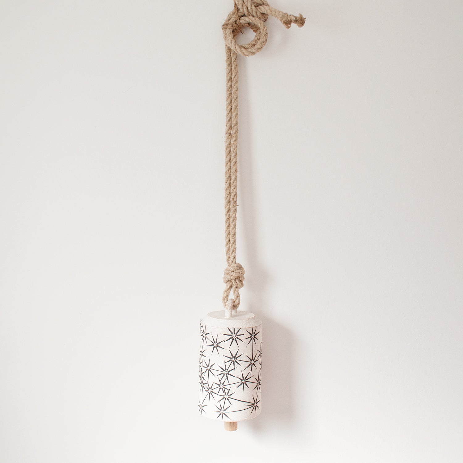 Ring in all things new and beautiful with a wheel-thrown stoneware bell from MQuan. Handmade and hand-painted with constellations, it's assembled with a wood knocker and hemp rope. An incredible piece of art for your home. Safe to hang indoors or out.
