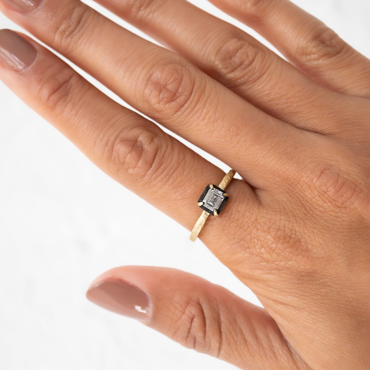 A perfectly exquisite one-of-a-kind solitaire ring from TAP by Todd Pownell. Dazzling within a darkened 14k white gold halo sits a single prong-set diamond. The yellow gold band with hand-hammered texture completes the organically elegant look.