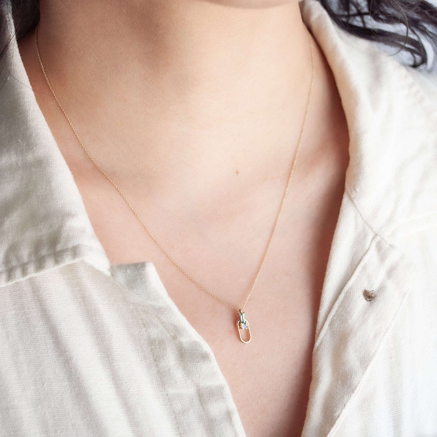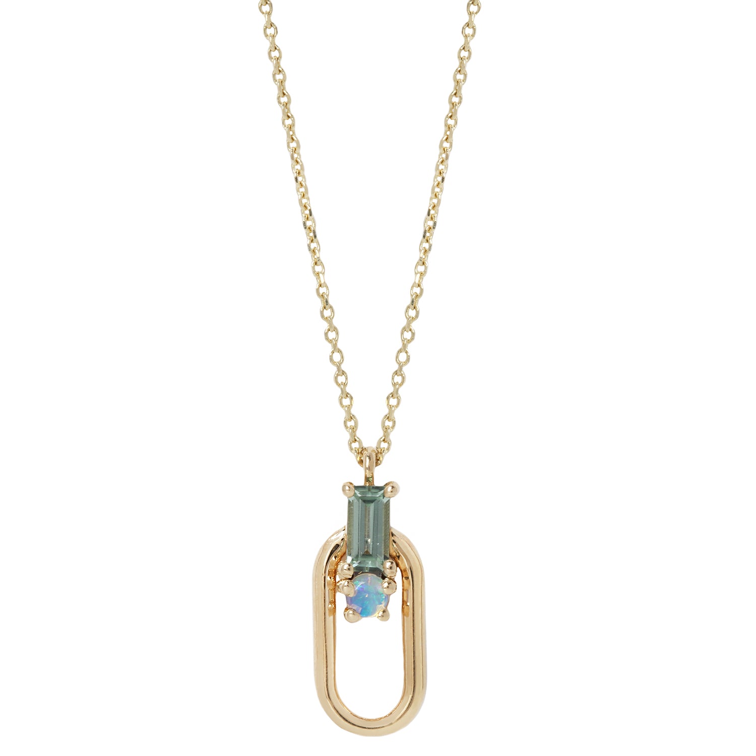 WWAKE's version of a door knocker necklace features a green tourmaline and shiny opal with a hoop of free-swinging recycled gold. This enchanting necklace comes from WWAKE's Brickwork Series - each stone and metal piece comes together in beautiful, masonry-like harmony. Natural color variation in the stones makes each necklace unique.