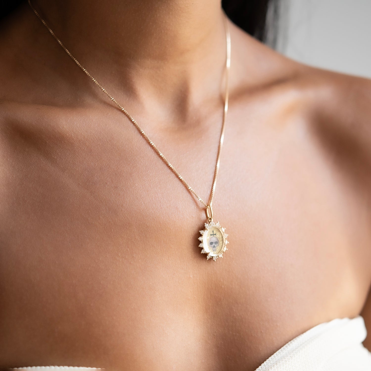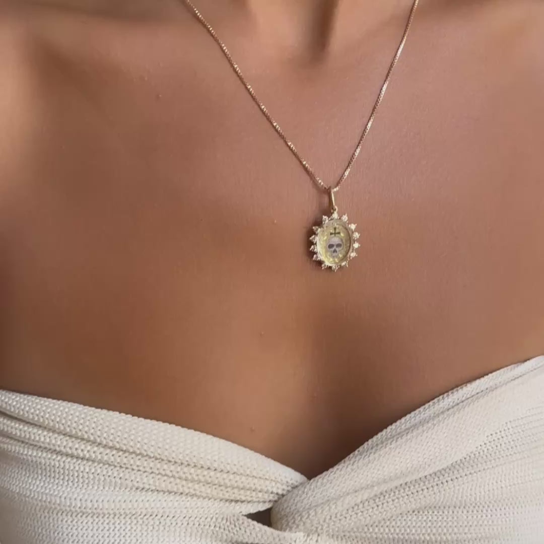 This Erica Molinari charm showcases meticulous hand-painted details complemented by a white sapphire crystal slice on its surface, making it a true work of art. Inspired by old Roman coins and rustic design, the hand crafted enamel skull is surrounded with a bright white diamond halo. Charm only, chain sold separately.