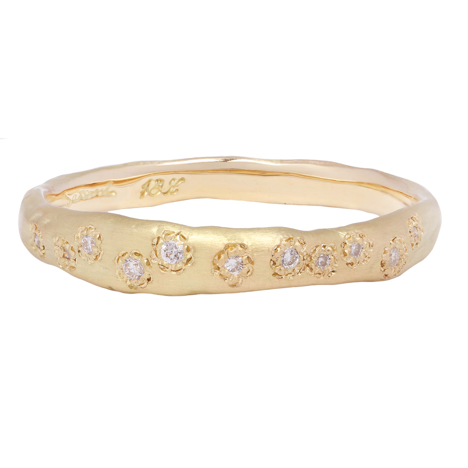 A refined half eternity band featuring scattered star-set diamonds across its surface, finished with a subtle satin matte texture that catches light beautifully. Each piece is meticulously handcrafted by Satomi Kawakita combining timeless elegance with contemporary artisanal craftsmanship. Perfect as a standalone statement or layered with other rings.