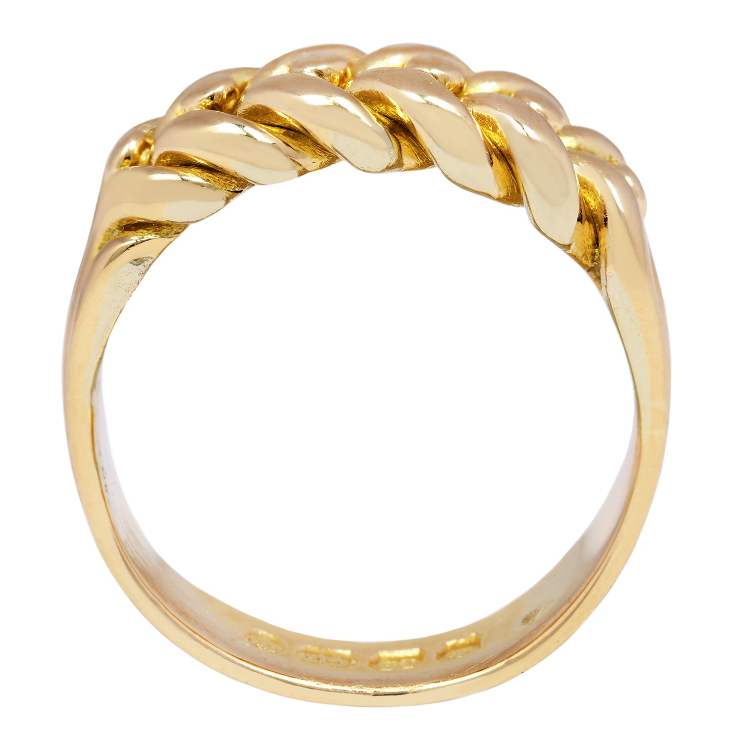 The perfect everyday statement ring or unique wedding band, keeper rings have long symbolized enduring love. This knotted style came into vogue during the Victorian era. Worn on top of a wedding ring, the "keeper ring" kept it safe from ever coming off. Completely one-of-a-kind, hallmarks stamped inside the band reveal its origin in 1890 Birmingham, England.
