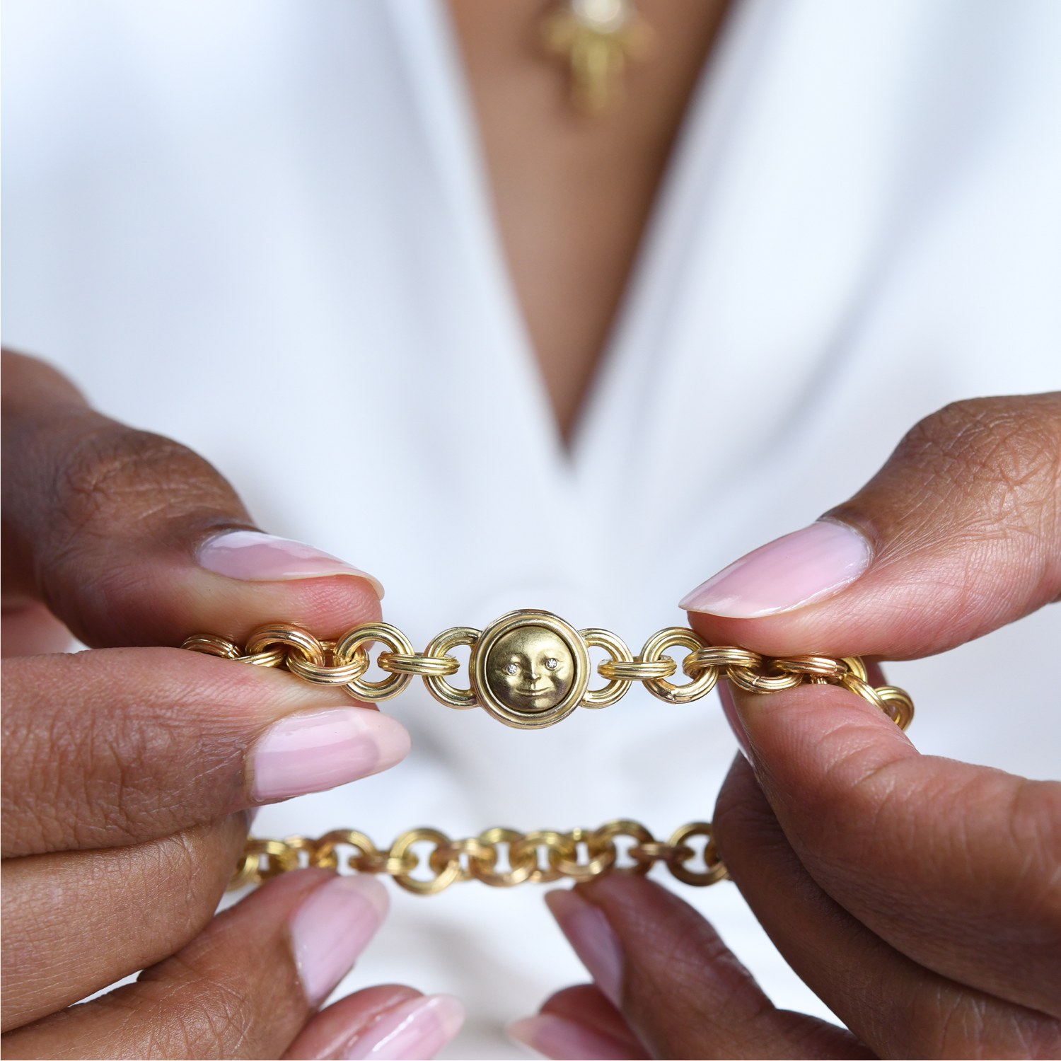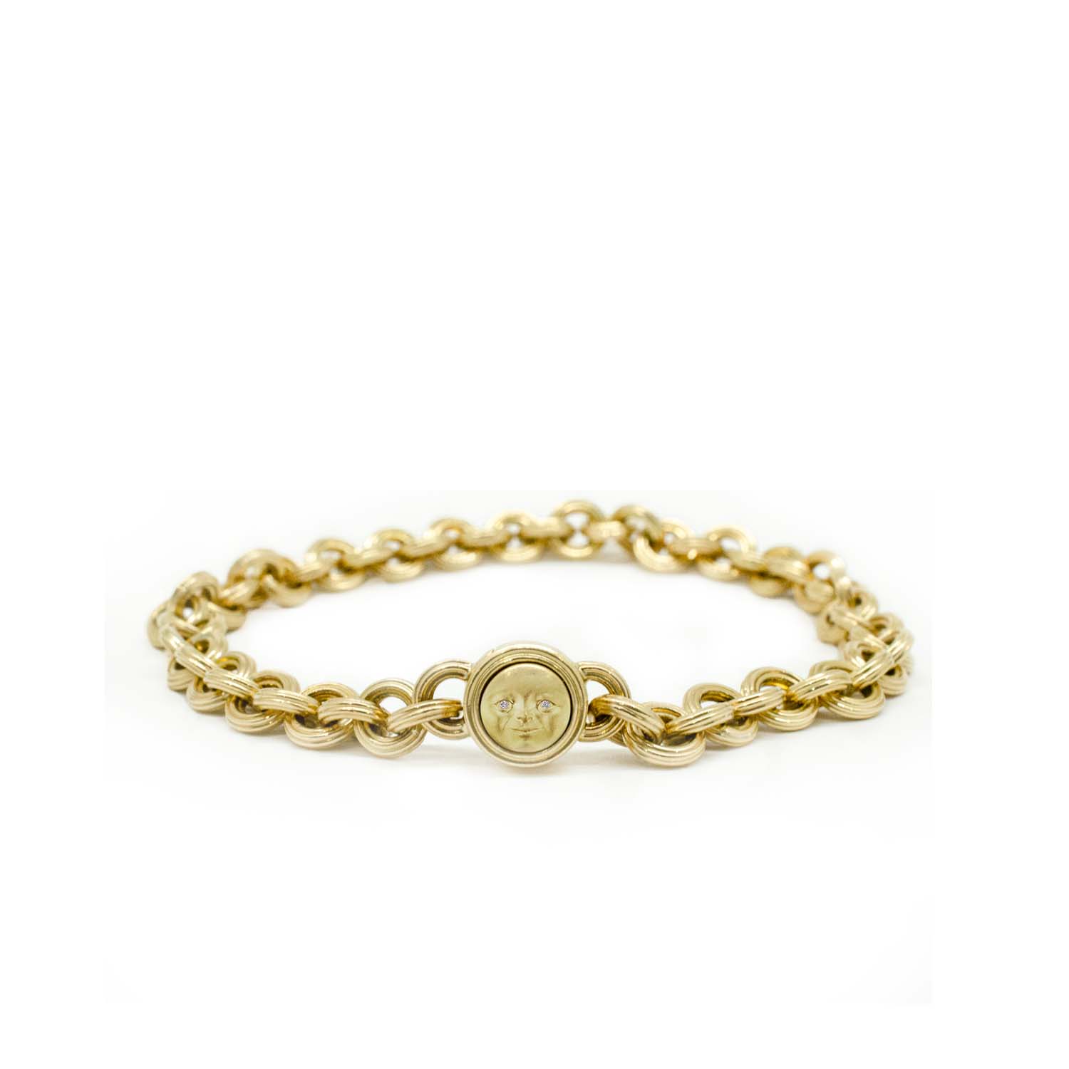 This handcrafted fluted wire chain bracelet features a concealed clasp set behind Anthony's signature Moonface adorned with diamond eyes. As part of the Celestial collection—Anthony’s most expansive jewelry range—it narrates a celestial journey through the cosmos and art history. The collection is inspired by Anthony's fascination with artisanal horology, early timekeeping, and the intricate Renaissance mechanisms that blend art and science. This bracelet can be made in lengths of 6"-8", please inquire.