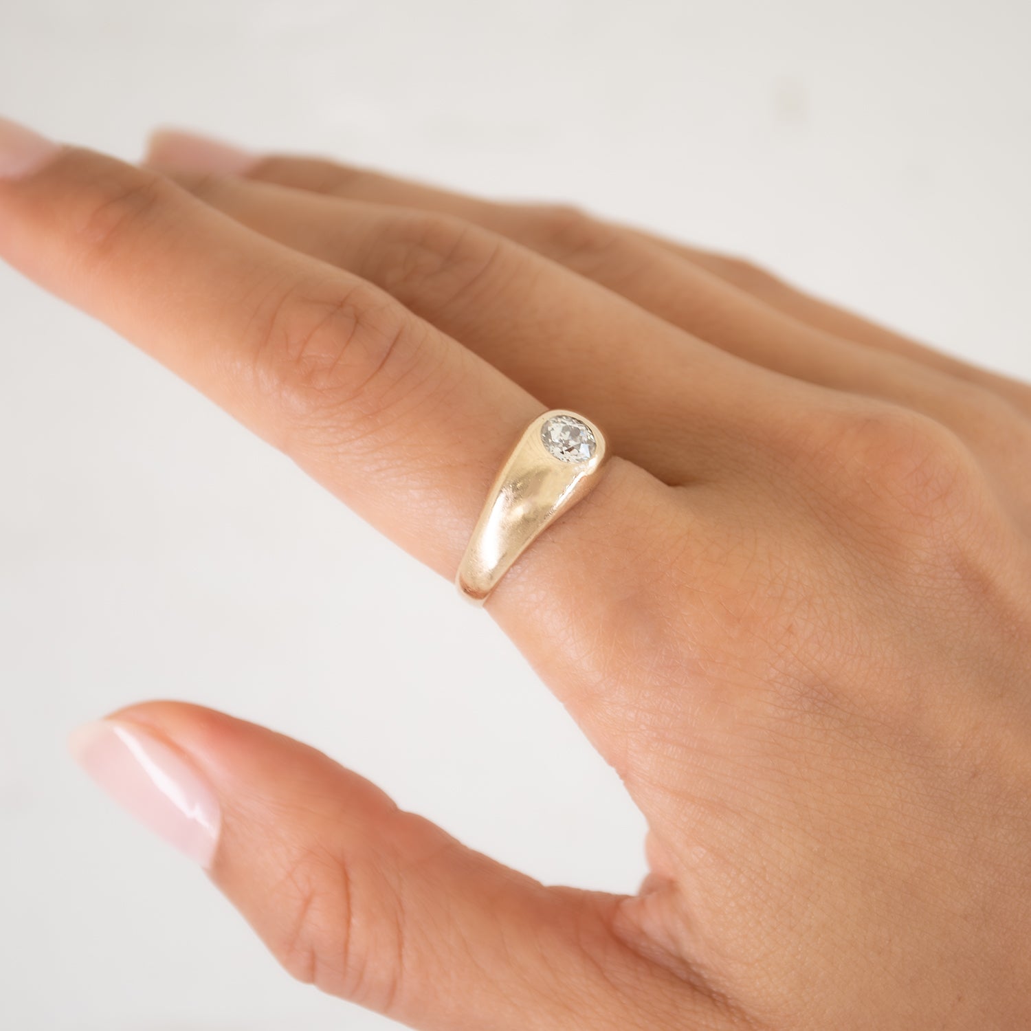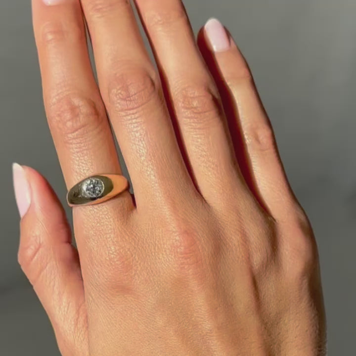 The Gilded Diamond Dome Ring is a one-of-a-kind vintage treasure. A sparkling flush-set diamond glows from the domed design. With its high-shine finish and tapered back, this ring feels as luxurious as it looks.