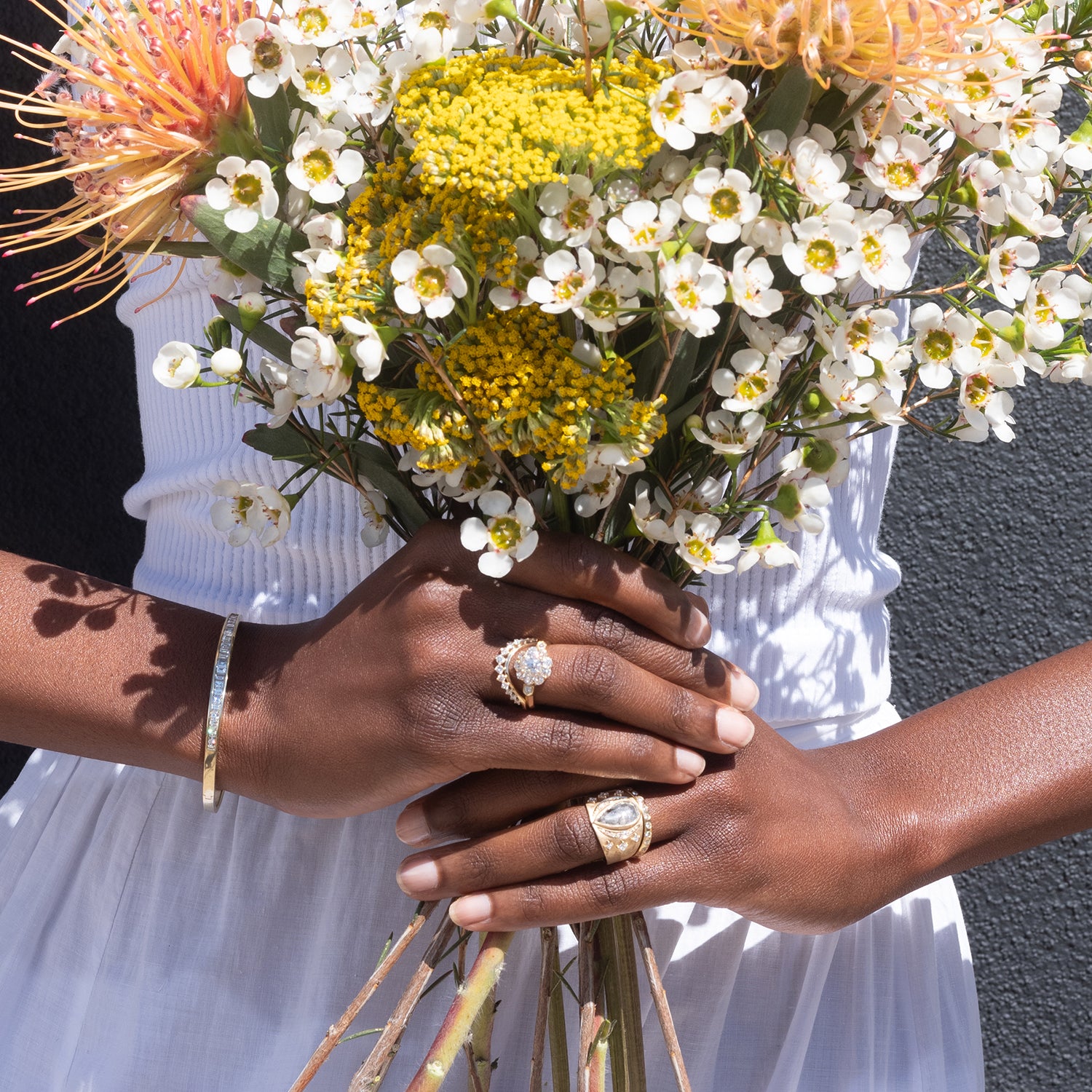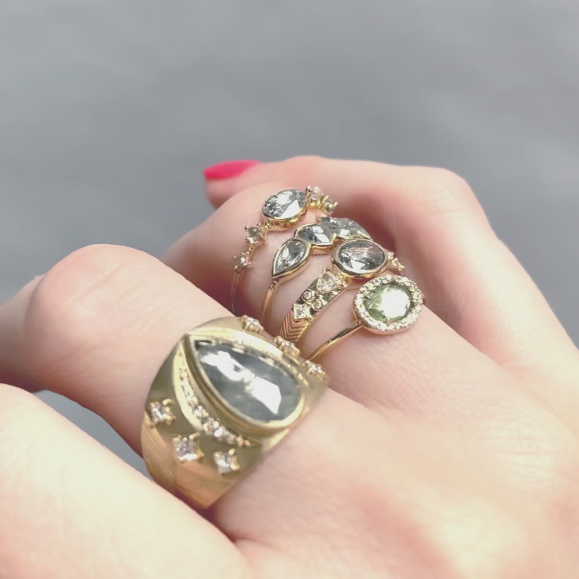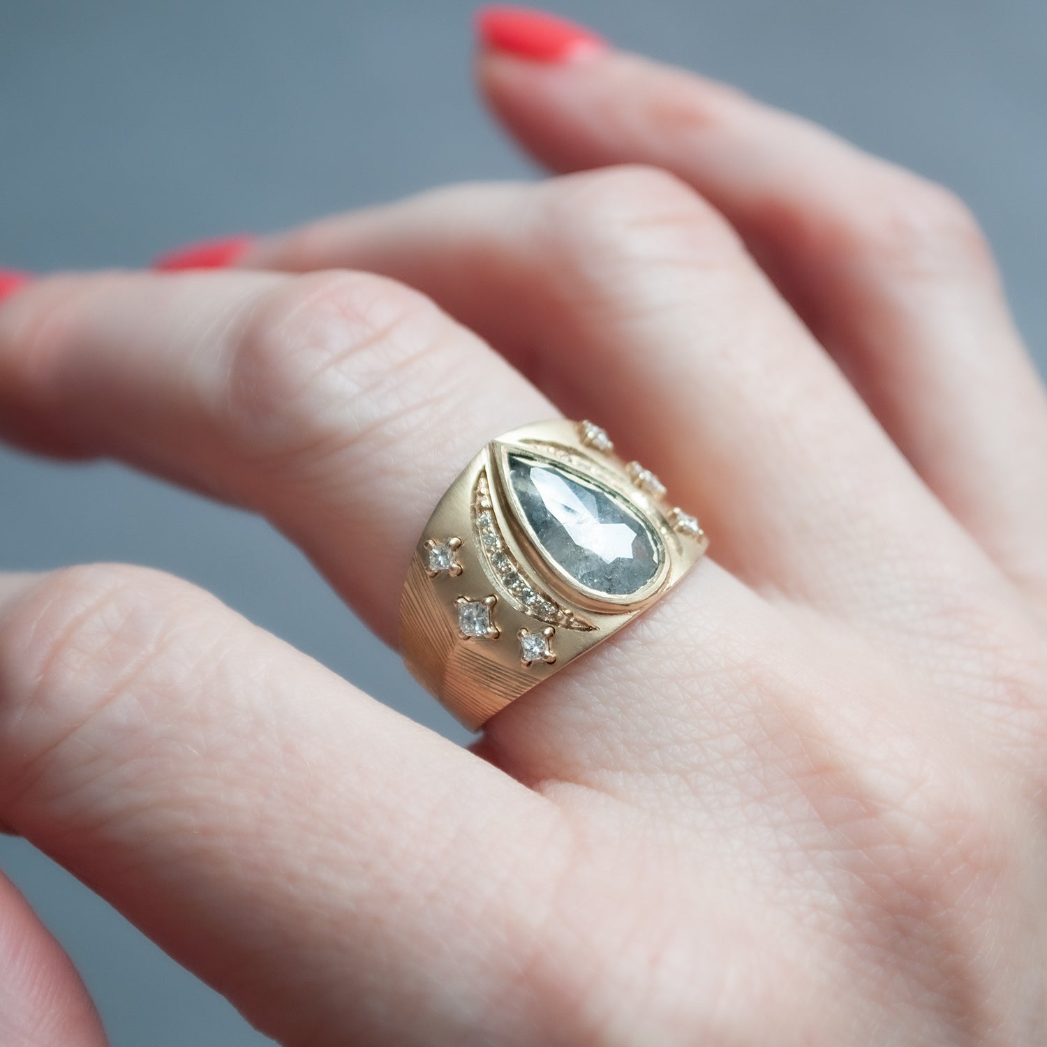 Make a stunning statement with a massive pear shape diamond and thick hand-engraved band. Bright white diamonds sparkle throughout the satin matte gold for major shine. Even more enchanting are the diamond crescent moon shapes framing the center stone. The Grand Diamond Vega Ring ring by Celine D'Aoust is one-of-a-kind.