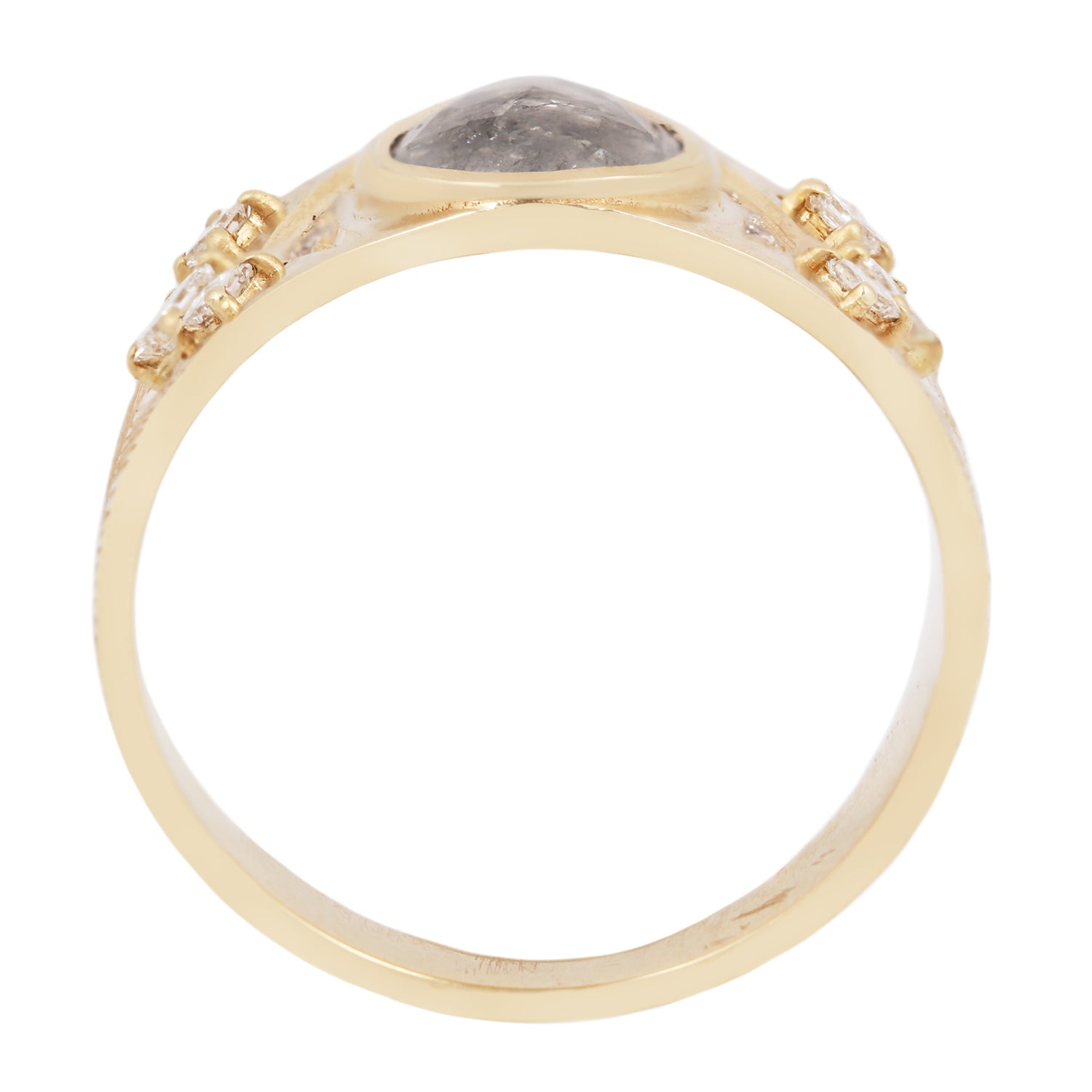 Stones: Center: 1.75ct Salt & Pepper Rose Cut Pear-shape Diamond, Sides: Total .26tcw White Diamonds
