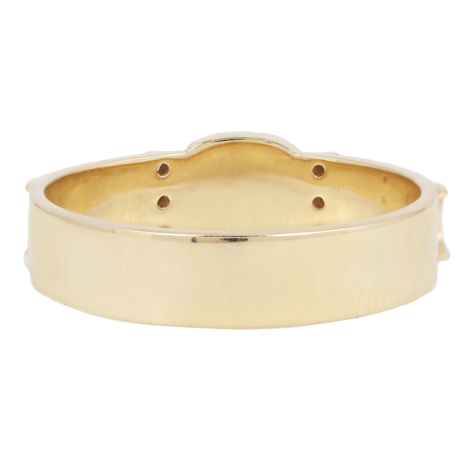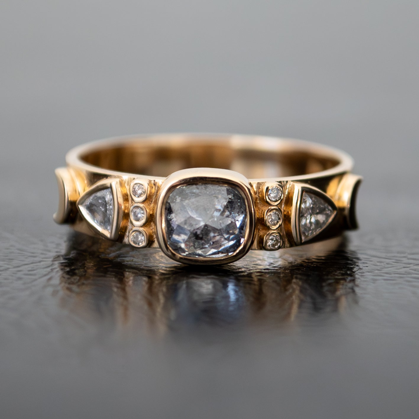 A wide smoky gray diamond is the focal point of this signature gold band by Celine D'Aoust. Round diamonds, gray trillions, and crescent moons flank the center stone, creating a powerful totem. This ring is one of a kind.