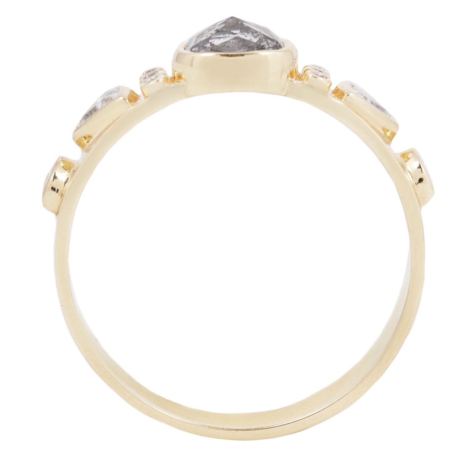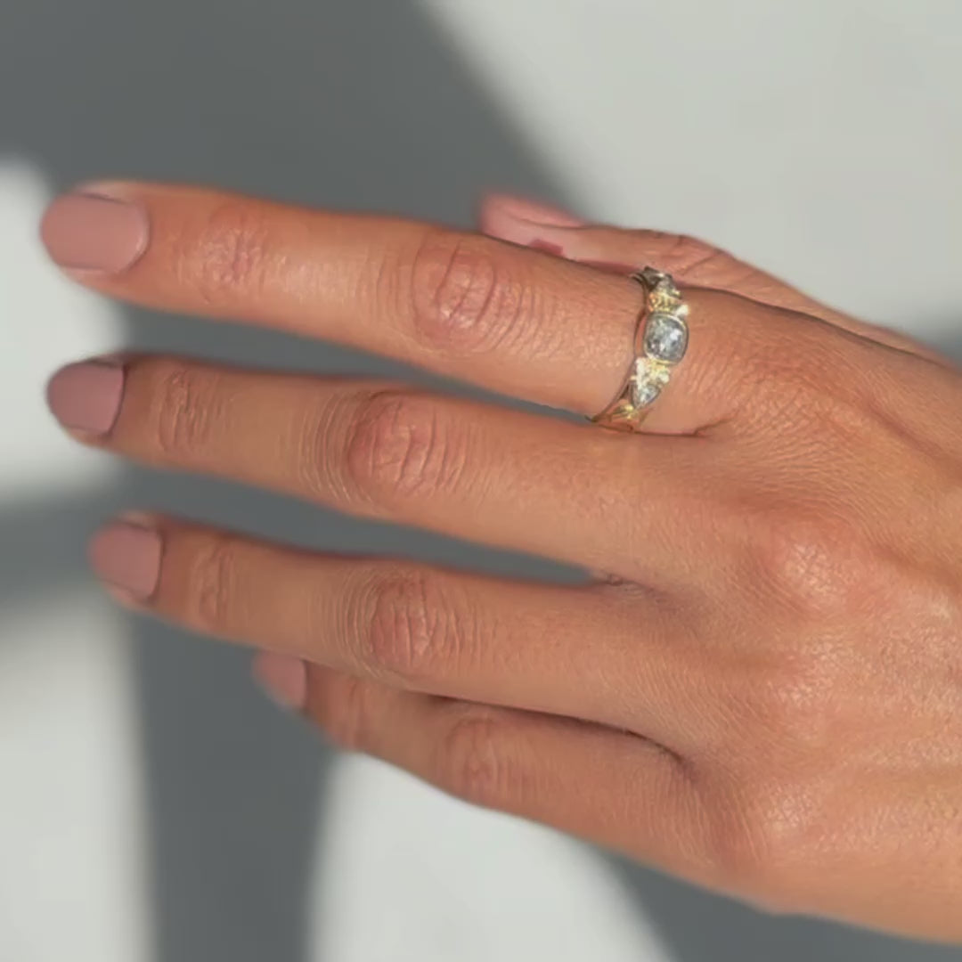 Stones: Center: .71ct Gray Rose Cut Diamond, Sides: Total .07tcw Gray Trillion Diamonds and Total .03tcw White DiamondsMetal: 14k Yellow Gold