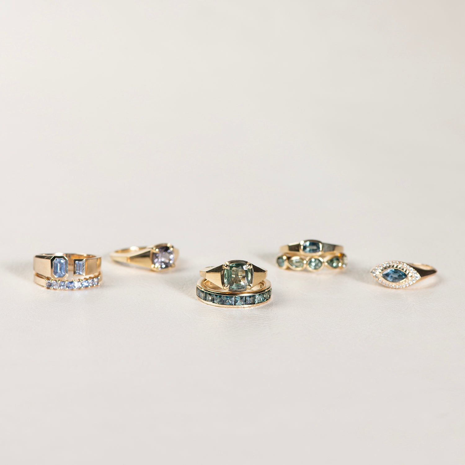 Dive into the deep shades of this watery green sapphire. This one-of-a-kind empire ring has a prong set stone with broad, tapered shoulders and a high-shine polish. This green sapphire ring is part of Lauren Wolf's signature Empire Collection.