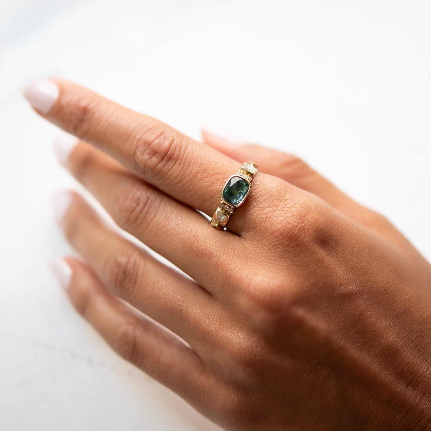 A deep sea green tourmaline sets this one of a kind ring apart. Sparkly side diamonds give way to a delicate, hand-engraved feather design along the band. This Totem ring is one of Celine D'Aoust's signature one of a kind designs.