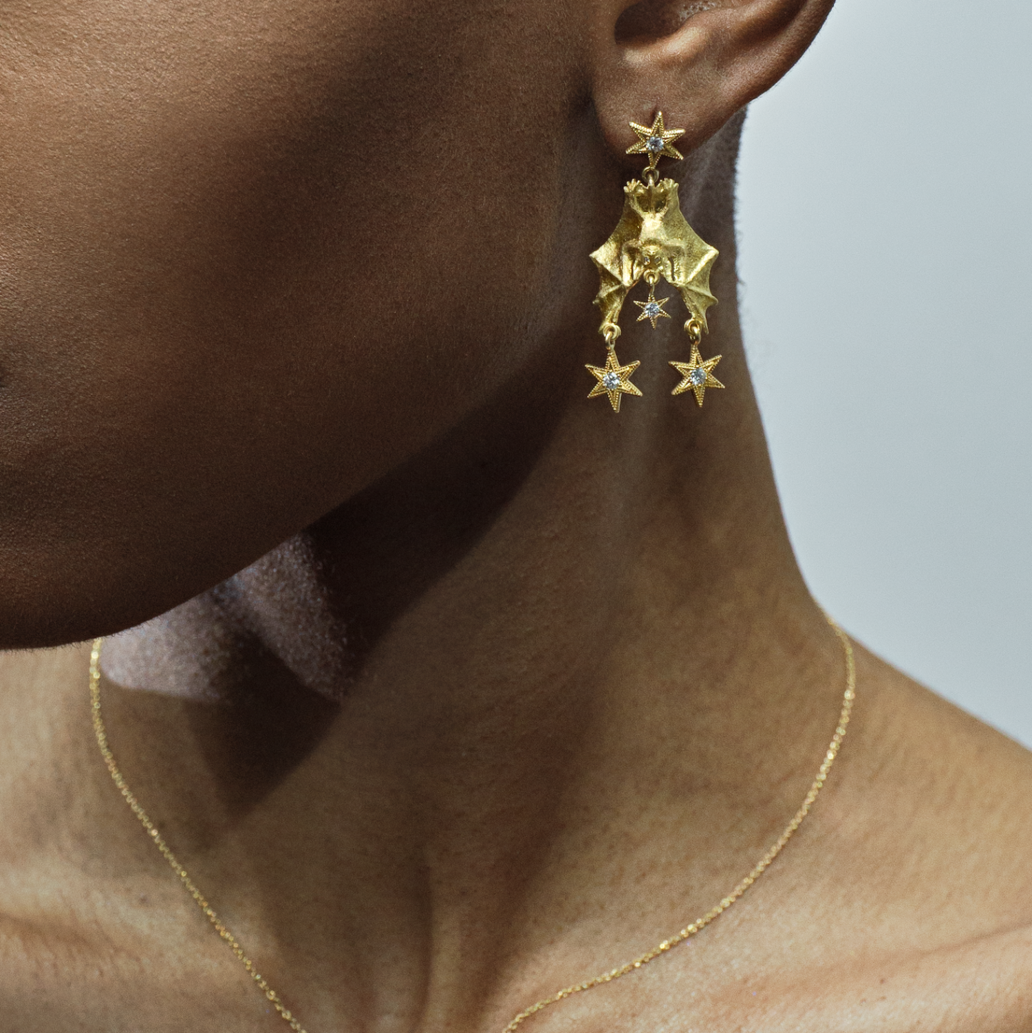 These one of a kind earrings by Anthony Lent feature handcrafted flying foxes suspended upside down, adorned with and surrounded by diamond stars. The flying fox, a creature that has captivated Anthony since his experience in Bali, serves as the inspiration behind this exceptional design. Sold as a pair.