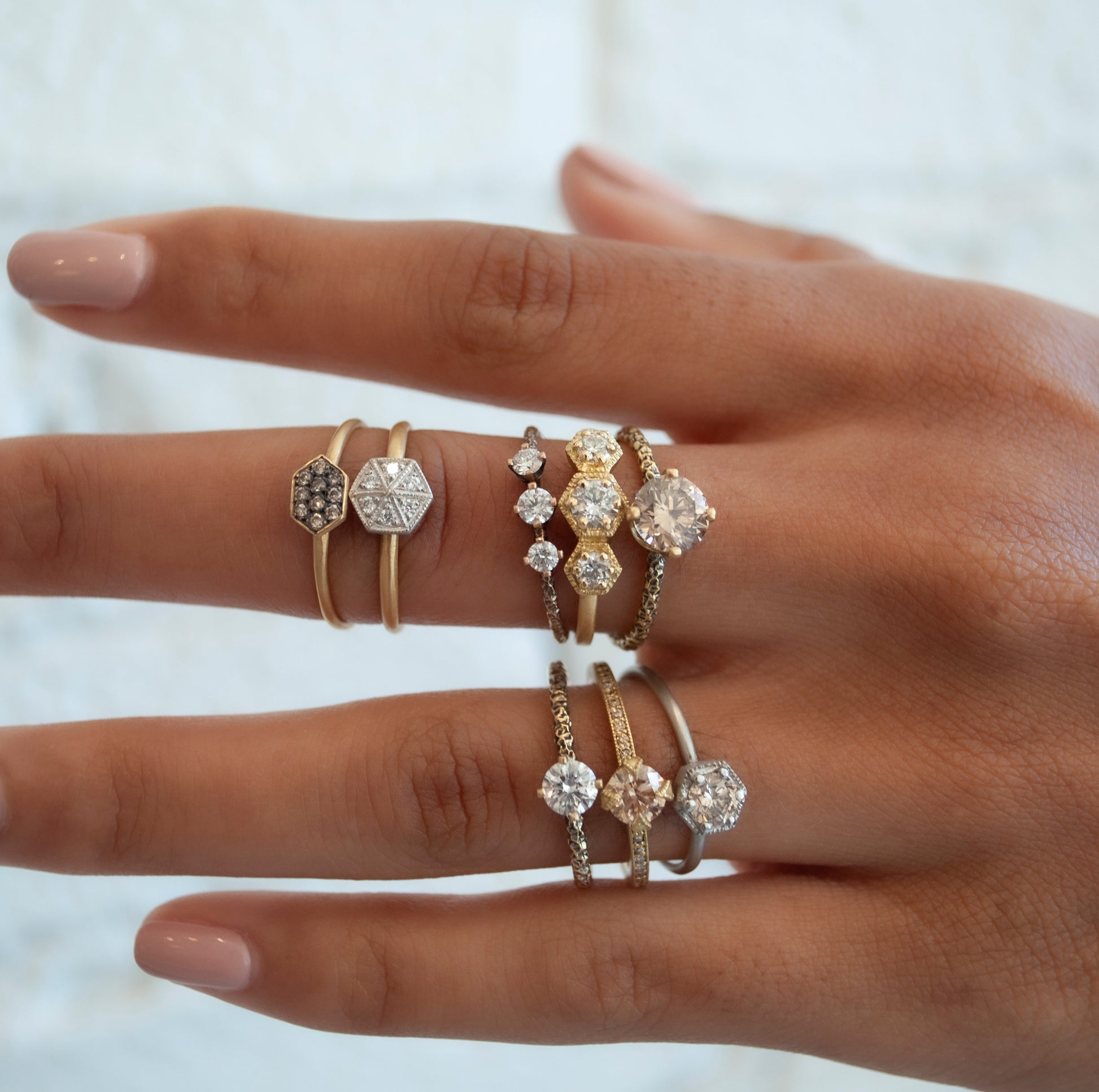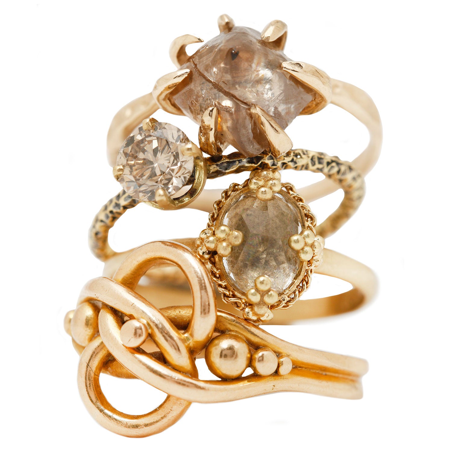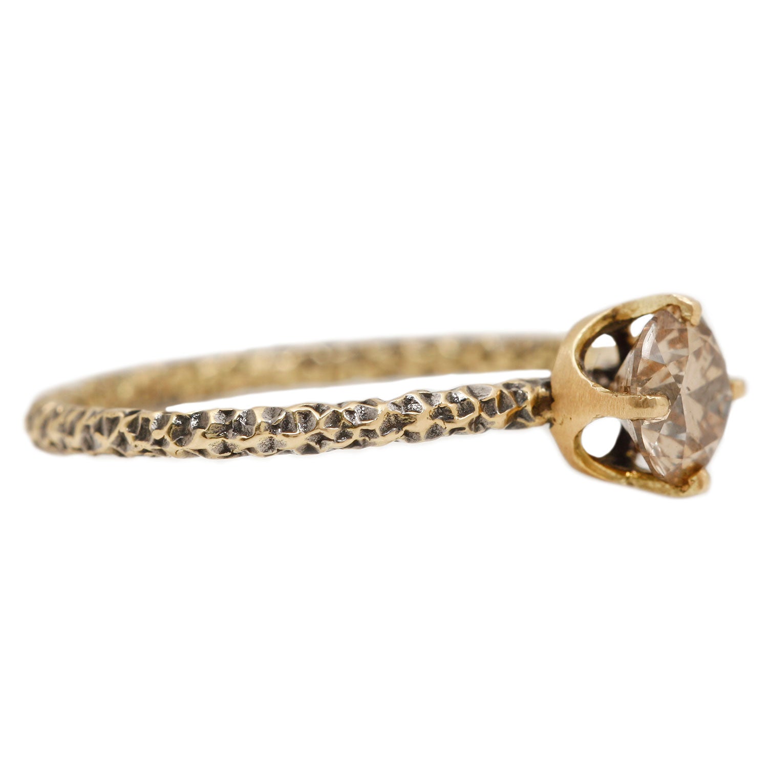 A brown diamond sparkles like brown sugar in a warm yellow gold setting. The thin textured band has cool blackened details that magnify the rich glow of the solitaire diamond. Sweetness with an edge from Satomi Kawakita.