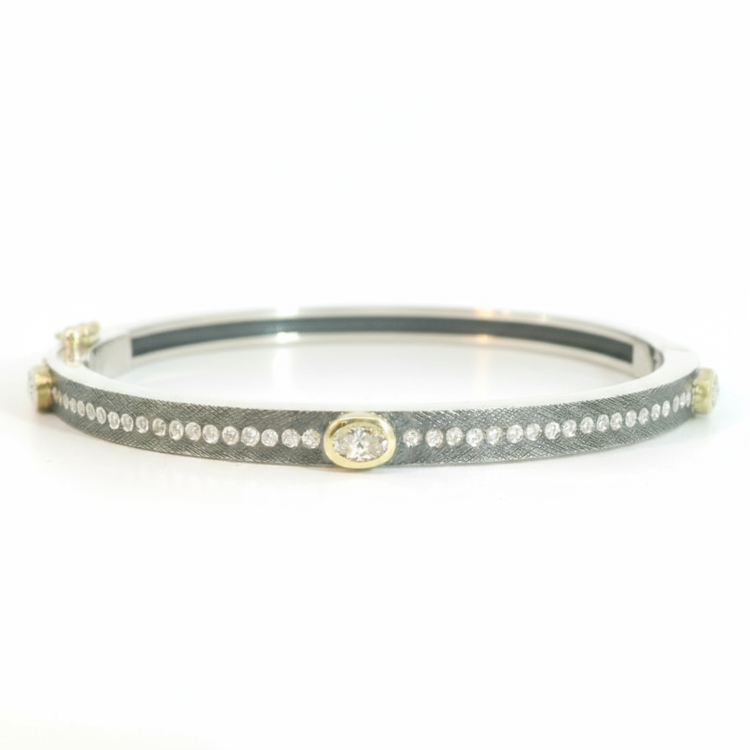 A signature piece by Rene Escobar, this sterling silver bangle features a row of white diamonds along the front, complemented by three prominent oval diamonds set in yellow gold bezels. It is secured with a gold push-lock closure and a safety hook for added security. Expertly handcrafted by Rene Escobar.