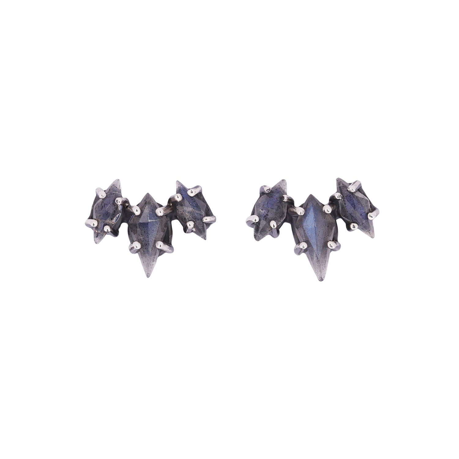 Featuring three kite-cut labradorites secured in a prong setting, these handcrafted studs showcase an oxidized sterling silver setting that enhances their raw, contemporary aesthetic. Designed by Michael Spirito, each pair presents an unconventional geometry and distinctive character ideal for those seeking statement jewelry with refined edge.