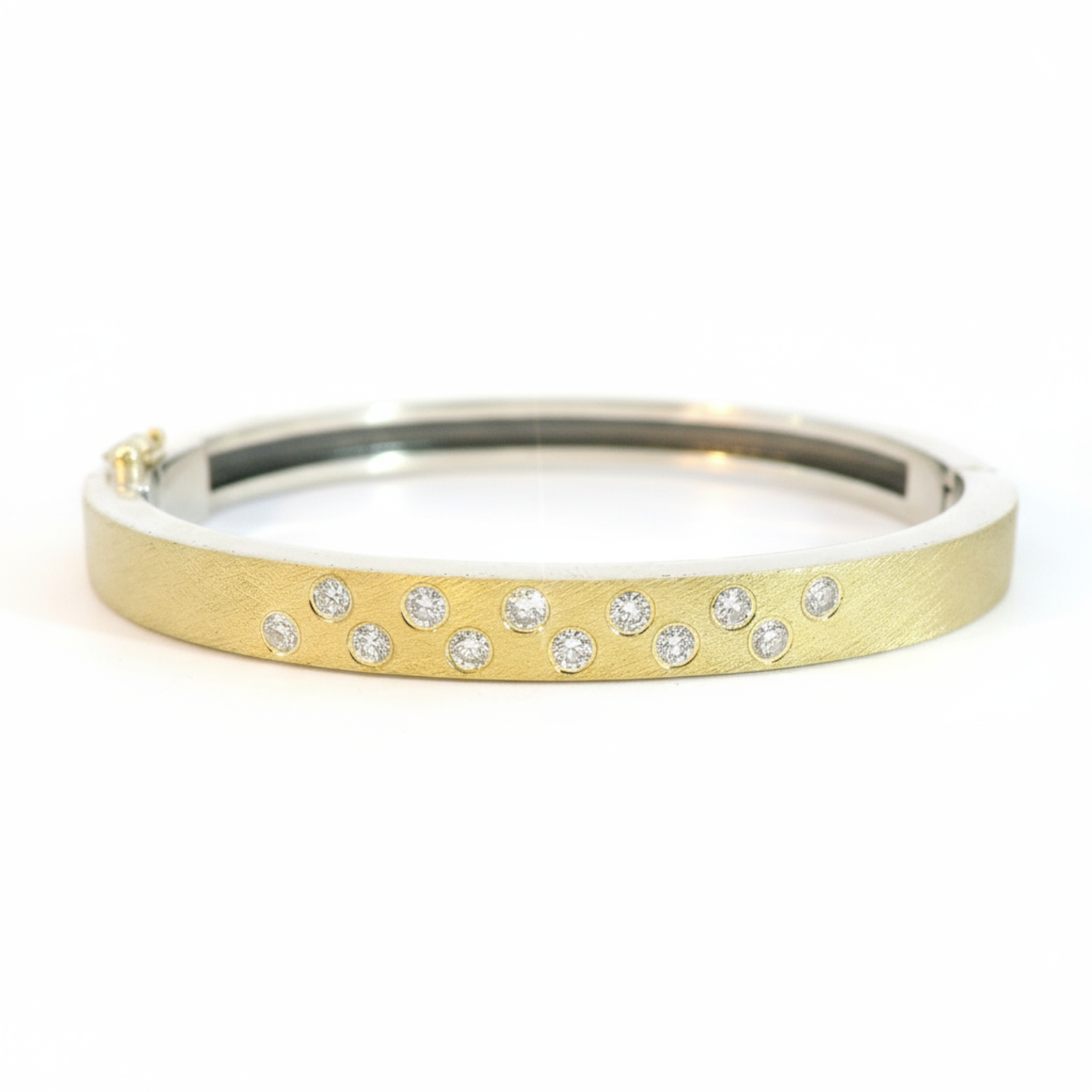 A classic design by Rene Escobar, this extra-wide bangle combines 18k yellow gold and sterling silver, accented by twelve flush-set white diamonds. The bold silhouette and metal contrast create a powerful yet elegant statement. Featuring a gold front and oxidized sterling silver back, it is equipped with a gold clasp for secure, comfortable wear. Handcrafted with precision by Rene Escobar.