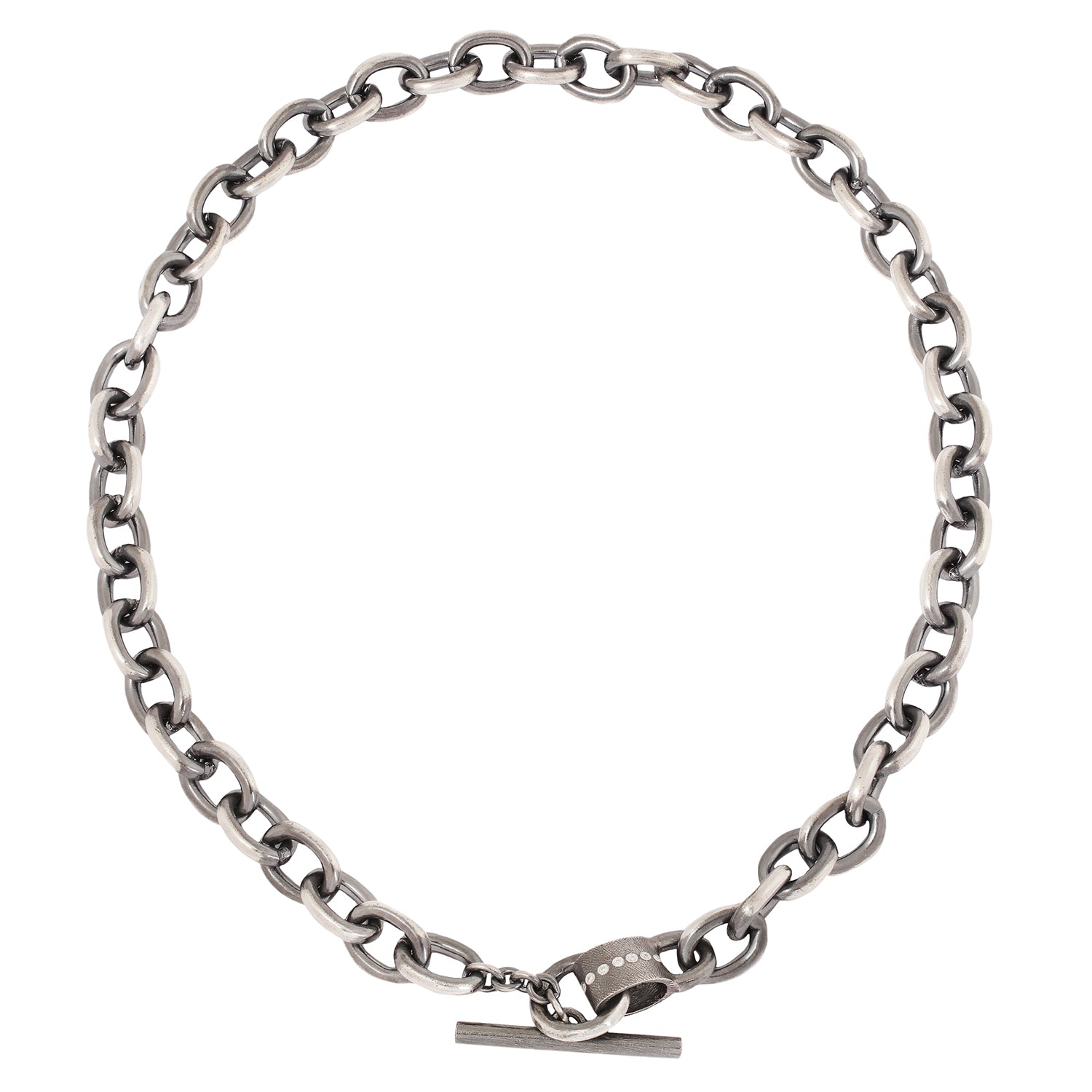 This necklace by Rene Escobar features dark, polished oxidized sterling silver links that create a striking look. The large toggle clasp is adorned with a row of brilliant cut white diamonds on each side of the loop, adding refined sparkle. Ideal for layering or as a standout piece for daily wear.